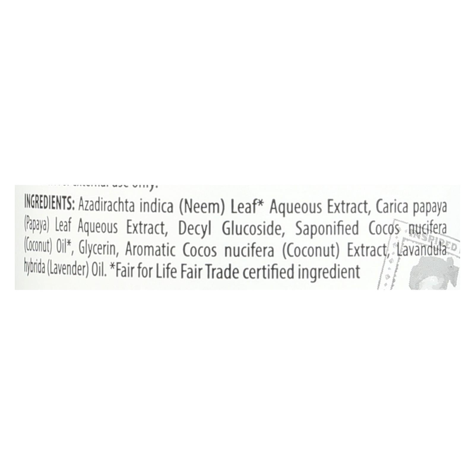 ingredients : azadirachta indica (neem) leaf aqueous extract;carica papaya (papaya) leaf aqueous extract;decyl glucoside;saponified cocos nucifera (coconut) oil;lauryl glucoside;glycerin;lavandula hybrida (lavender) oil;cocos nucifera (coconut) extract