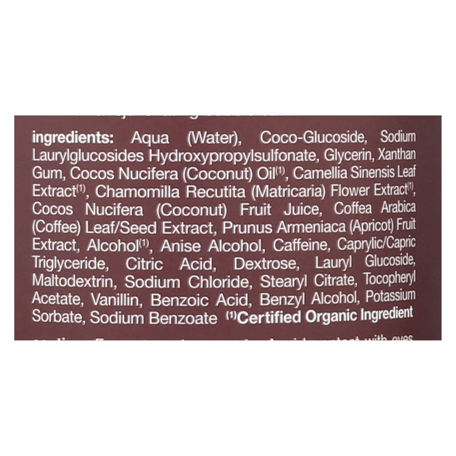 ingredients : aqua;water;coco-glucoside;sodium laurylglucosides hydroxypropylsulfonate;glycerin;xanthan gum;cocos nucifera;coconut;oil;1;camellia sinensis leaf extract;chamomilla recutita;matricaria;flower extract;fruit juice;coffea arabica;coffee;leaf/seed extract;prunus armeniaca;apricot;fruit extract;alcohol;anise alcohol;caffeine;caprylic/capric triglyceride;citric acid;dextrose;lauryl glucoside;maltodextrin;sodium chloride;stearyl citrate;tocopheryl acetate;vanillin;benzoic acid;benzyl alcohol;potassium