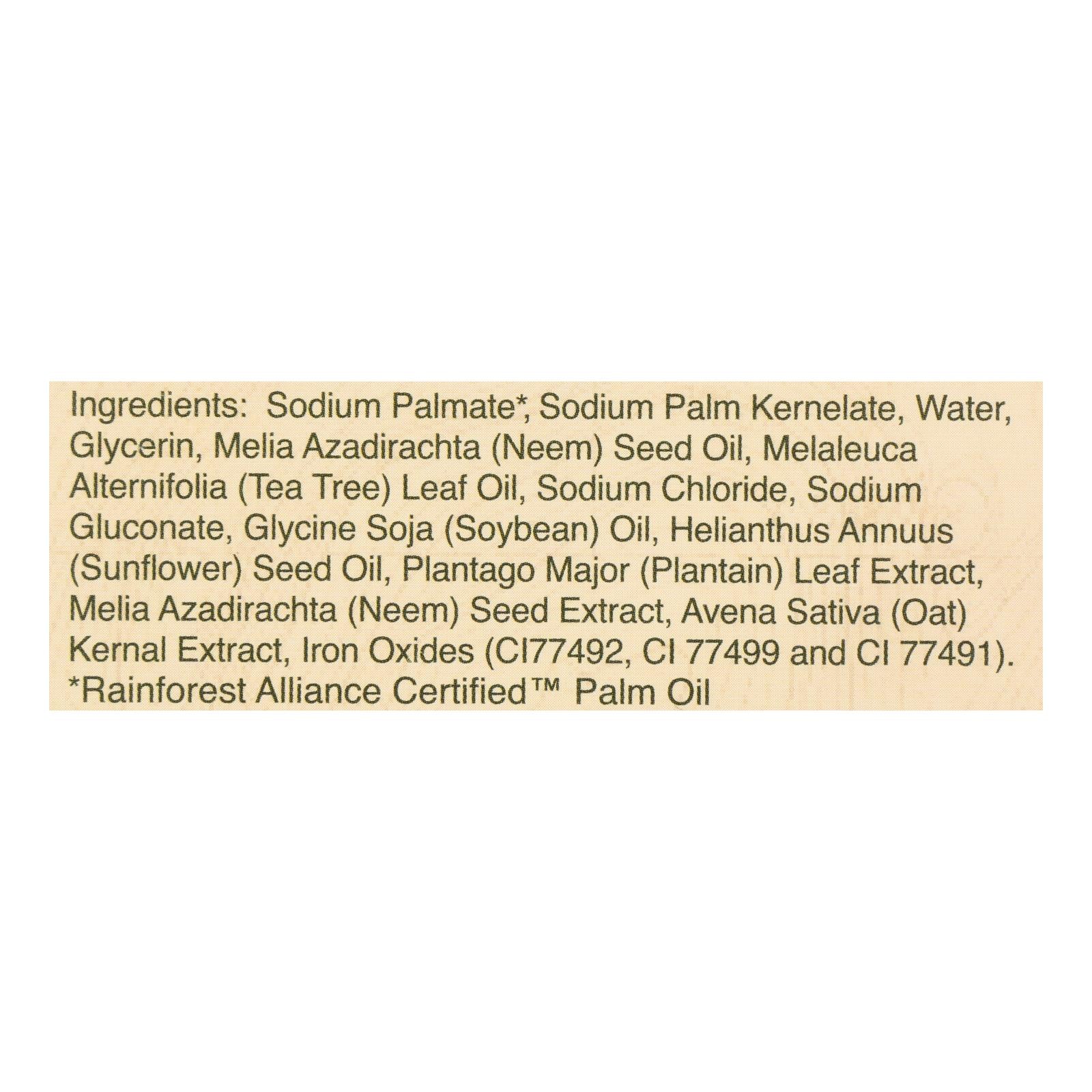 ingredients : sodium palmate;sodium palm kernelate;water;glycerin;melia azadirachta;neem;seed oil;melaleuca alternifolia;tea tree;leaf oil;sodium chloride;sodium gluconate;glycine soja;soybean;oil;helianthus annuus;sunflower;plantago major;plantain;leaf extract;seed extract;avena sativa;oat;kernal extract;iron oxides;ci77492;ci 77499 and ci 77491
