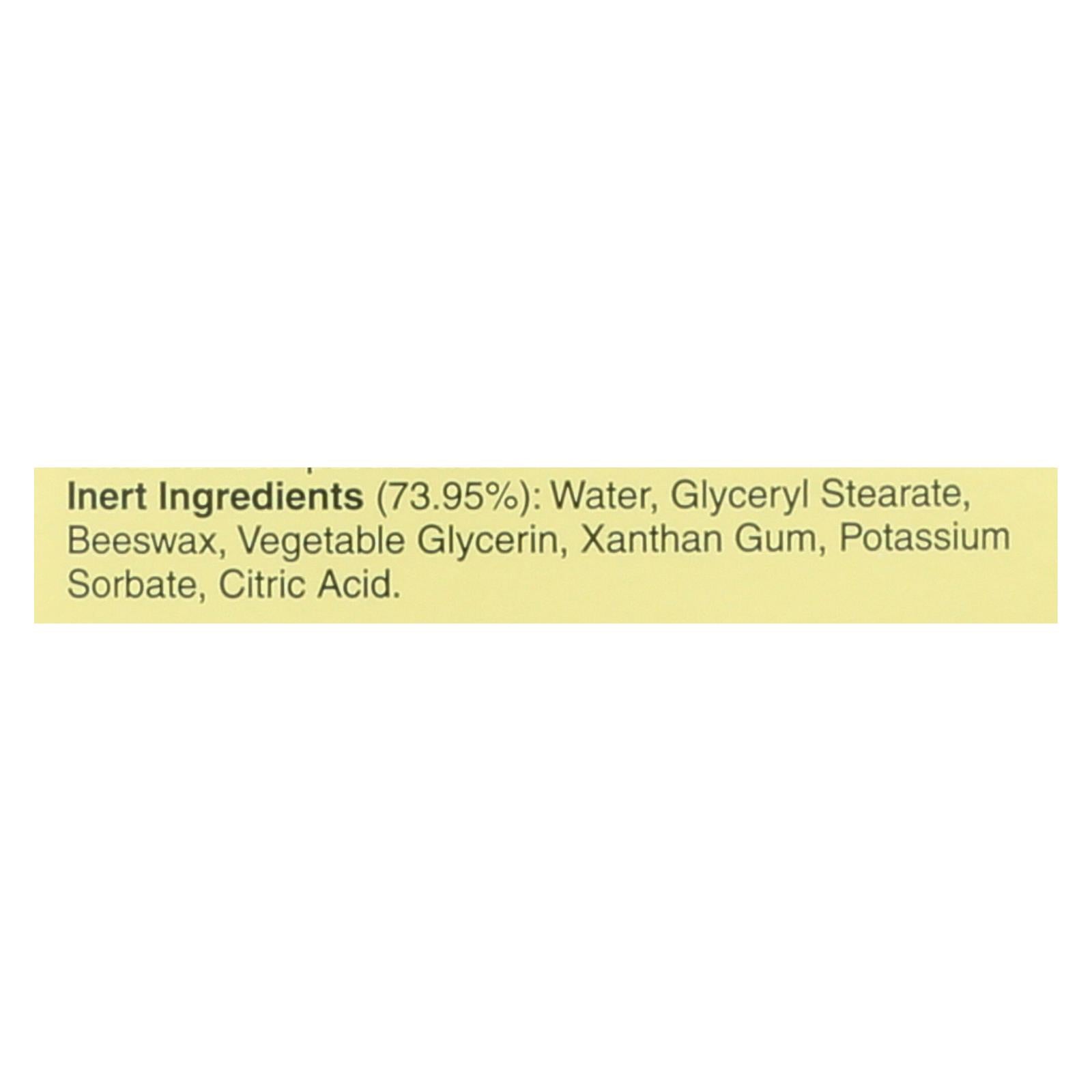 ingredients : oil of soybean 11.5% oil of citronella 10.0% oil of peppermint 2.0% oil of cedar 1.50% oil of lemongrass 1.00% oil of geranium 0.05% *inert 73.95%;water;glyceryl stearate;beeswax;vegetable glycerin;xanthan gum;potassium sorbate;citric acid