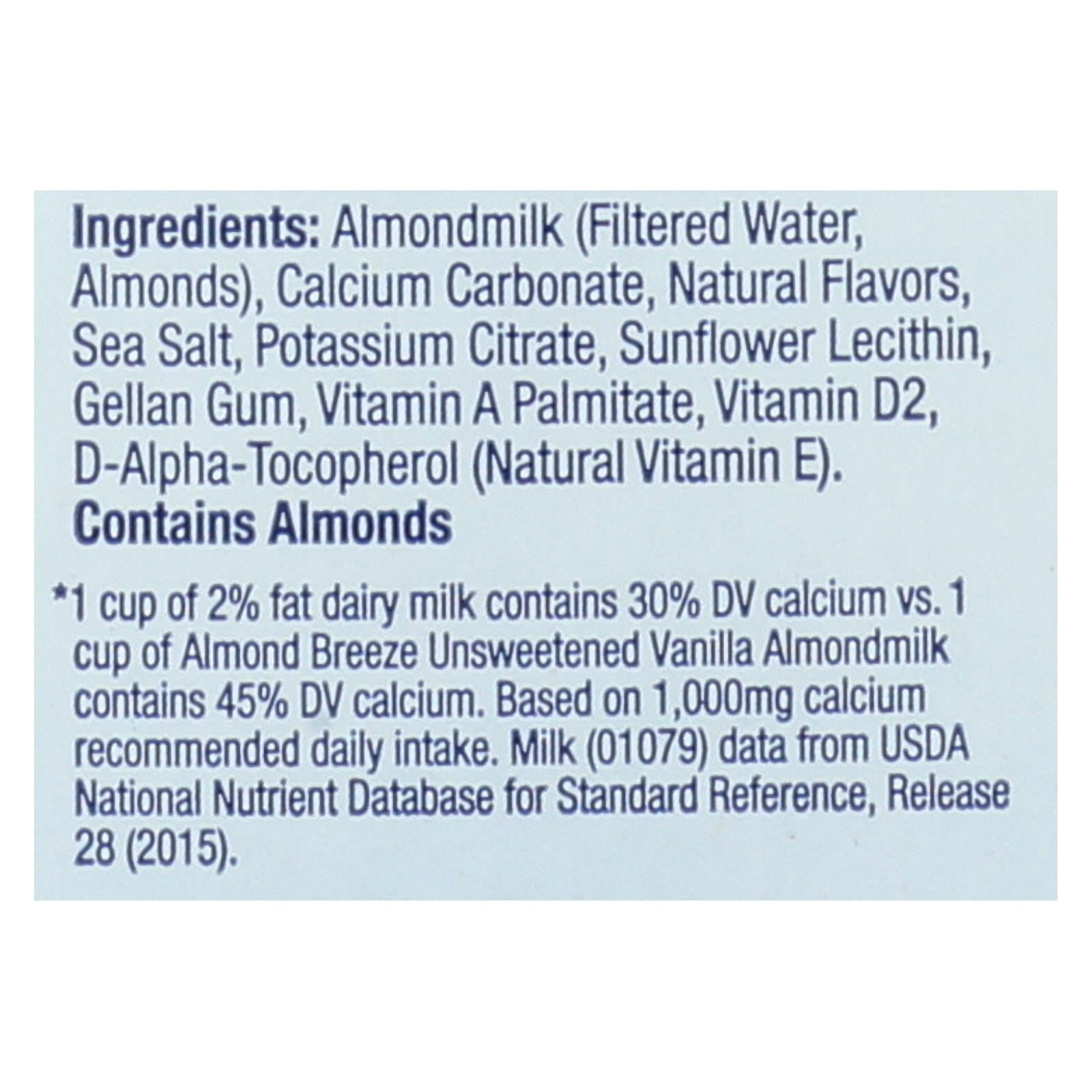 Almond breeze almond milk, vanilla unsweetened is a natural and delicious milk alternative. Made with natural ingredients, almond breeze almond milk is free of unnatural and unnecessary additives, making it a pure and healthy addition to a healthy and balanced diet. Each carton of almond breeze almond milk, vanilla unsweetened contains 64 fl. Oz. Of almond milk. Keep refrigerated, shake well before using and use within seven days of opening. See nutrition facts panel for allergens.
