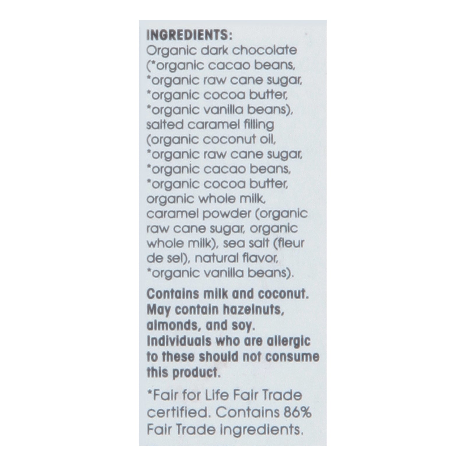 ingredients : organic dark chocolate (*organic cacao beans, *organic raw cane sugar, *organic cocoa butter, *organic vanilla beans);salted caramel filling (organic coconut oil, *organic raw cane sugar, *organic cacao beans, *organic cocoa butter, organic whole milk, caramel powder (organic raw cane sugar, organic whole milk), sea salt (fleur de sel), natural flavor, *organic vanilla beans)