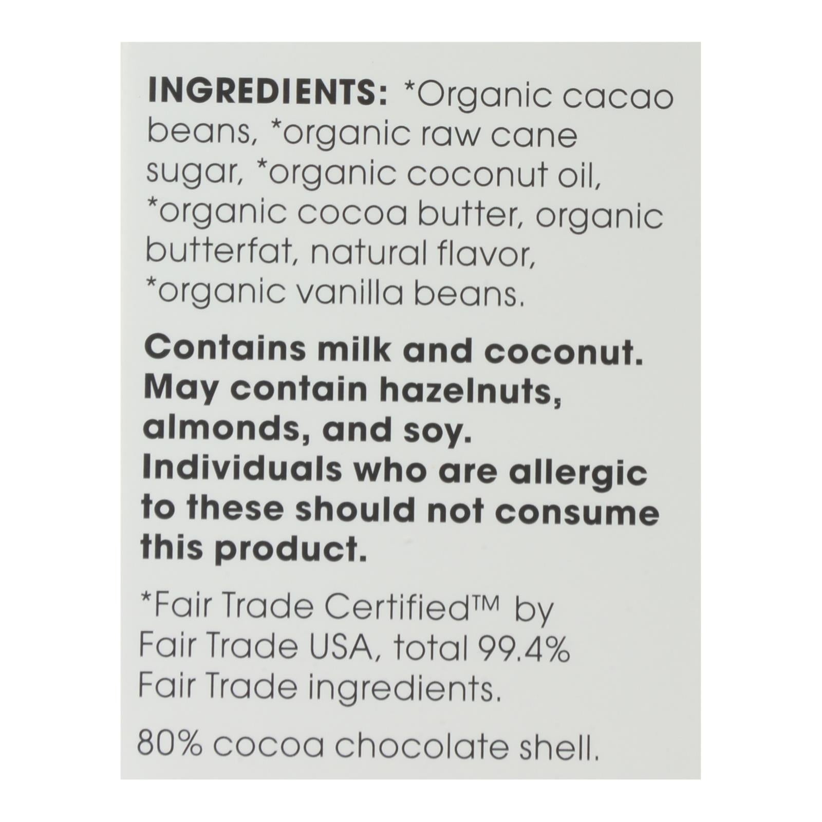 ingredients : organic cacao beans;organic raw cane sugar;organic coconut oil;organic cocoa butter;organic butterfat;natural flavor;organic vanilla beans
