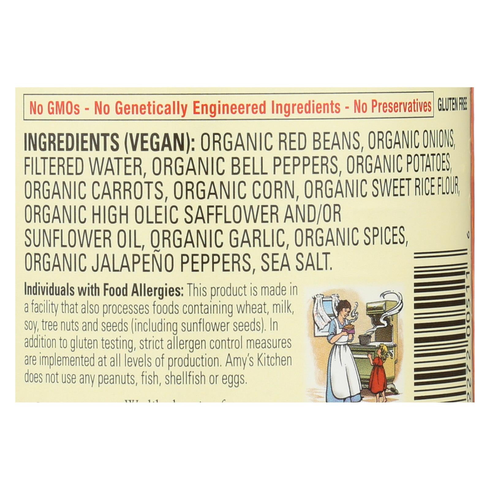 ingredients : organic red beans;organic onions;filtered water;organic bell peppers;organic potatoes;organic carrots;organic corn;organic sweet rice flour;organic high oleic safflower and/or sunflower oil;organic garlic;organic spices;organic jalapeno peppers;sea salt