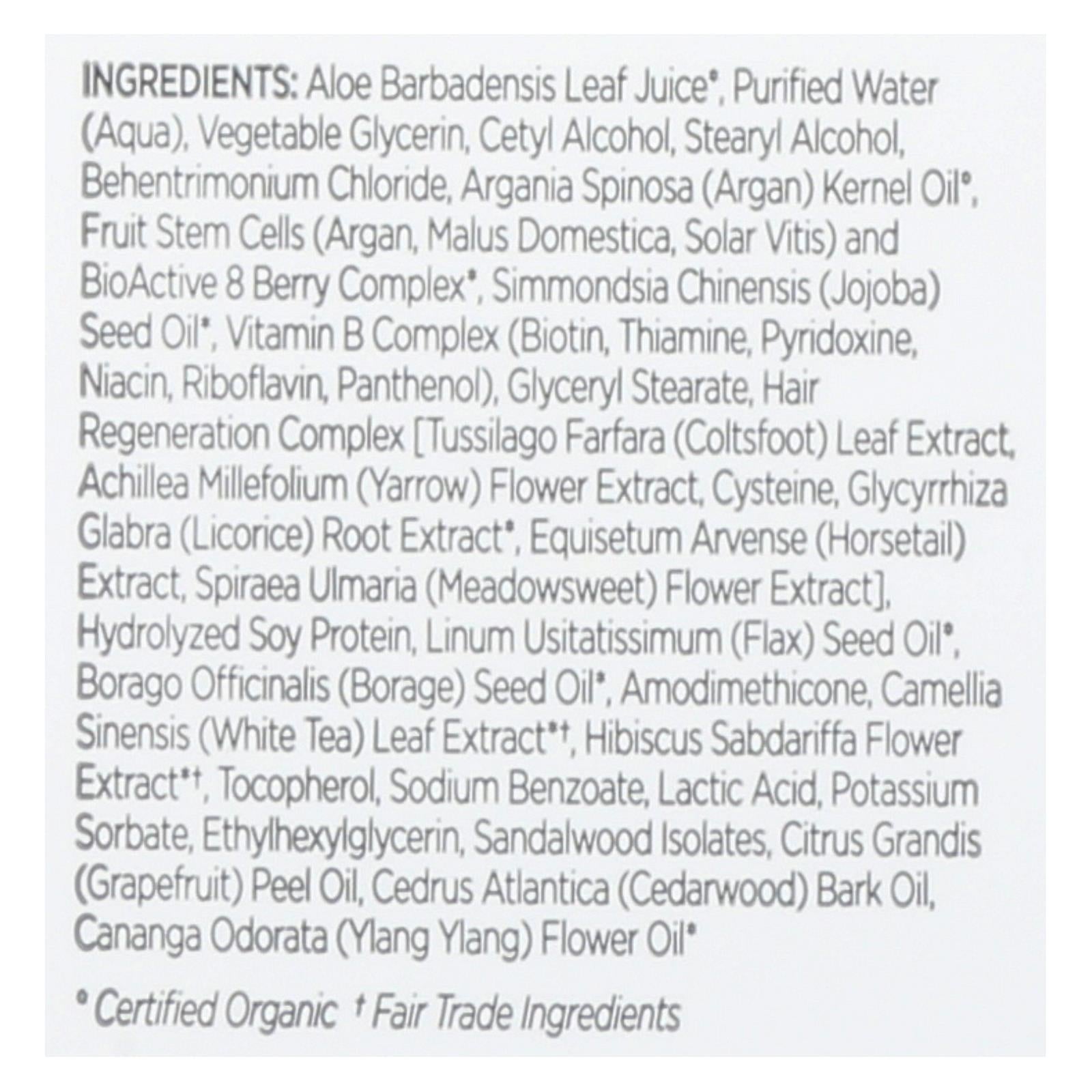 ingredients : aloe barbadensis leaf juice;purified water;aqua;vegetable glycerin;cetyl alcohol;stearyl alcohol;behentrimonium chloride;argania spinosa;argan;kernel oil;fruit stem cells;malus domestica;solar vitis;and bioactive 8 berry complex;simmondsia chinensis;jojoba;seed oil;vitamin b complex;biotin;thiamine;pyridoxine;niacin;riboflavin;panthenol;glyceryl stearate;hair regeneration complex [tussilago farfara;coltsfoot;leaf extract;achillea millefolium;yarrow;flower extract;cysteine;glycyrrhiza glabra;lico