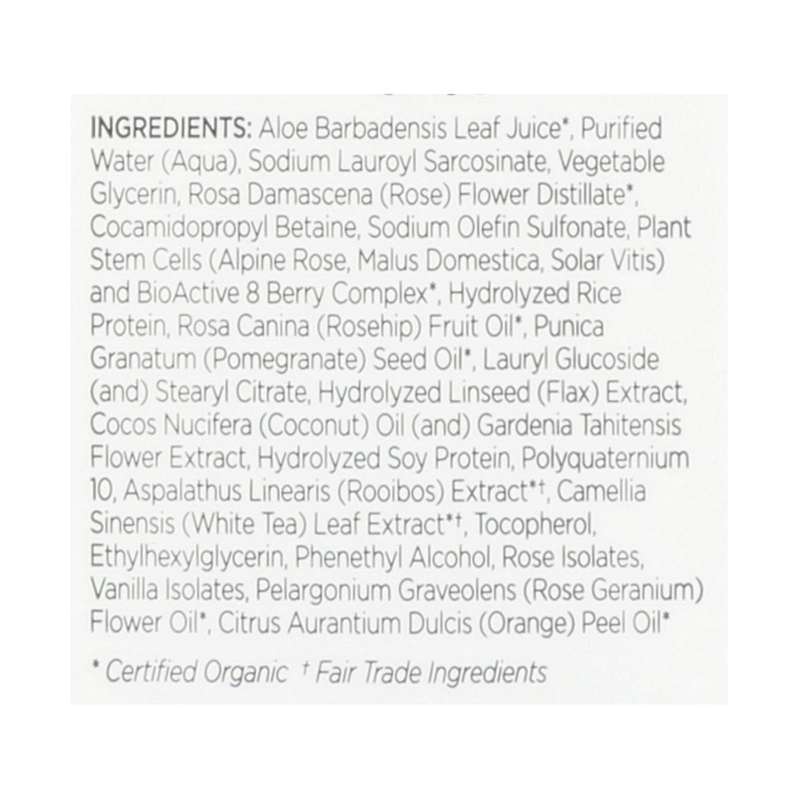 ingredients : aloe barbadensis leaf juice;purified water;aqua;sodium lauroyl sarcosinate;vegetable glycerin;rosa damascena;rose;flower distillate;cocamidopropyl betaine;sodium olefin sulfonate;plant stem cells;alpine rose;malus domestica;solar vitis;and bioactive 8 berry complex;hydrolyzed rice protein;rosa canina;rosehip;fruit oil;punica granatum;pomegranate;seed oil;lauryl glucoside;and;stearyl citrate;hydrolyzed linseed;flax;extract;cocos nucifera;coconut;oil;gardenia tahitensis flower extract;hydrolyzed s