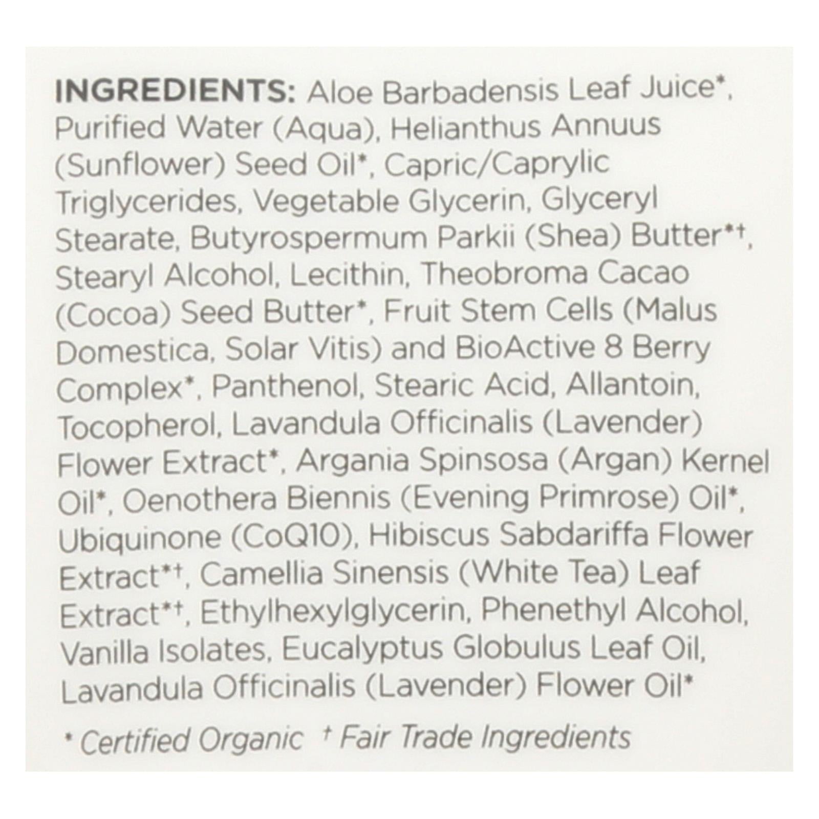 ingredients : aloe barbadensis leaf juice;purified water;aqua;helianthus annuus;sunflower;seed oil;capric/caprylic triglycerides;vegetable glycerin;glyceryl stearate alcohol;lecithin;theobroma cacao;cocoa;seed butter;fruit stem cells;malus domestica;solar vitis;and bioactive 8 berry complex;panthenol;stearic acid;allantoin;tocopherol;lavandula officinalis;lavender;flower extract;argania spinsosa;argan;kernel oil;oenothera biennis;evening primrose;oil;ubiquinone;coq10;hibiscus sabdariffa flower extract*†;camel