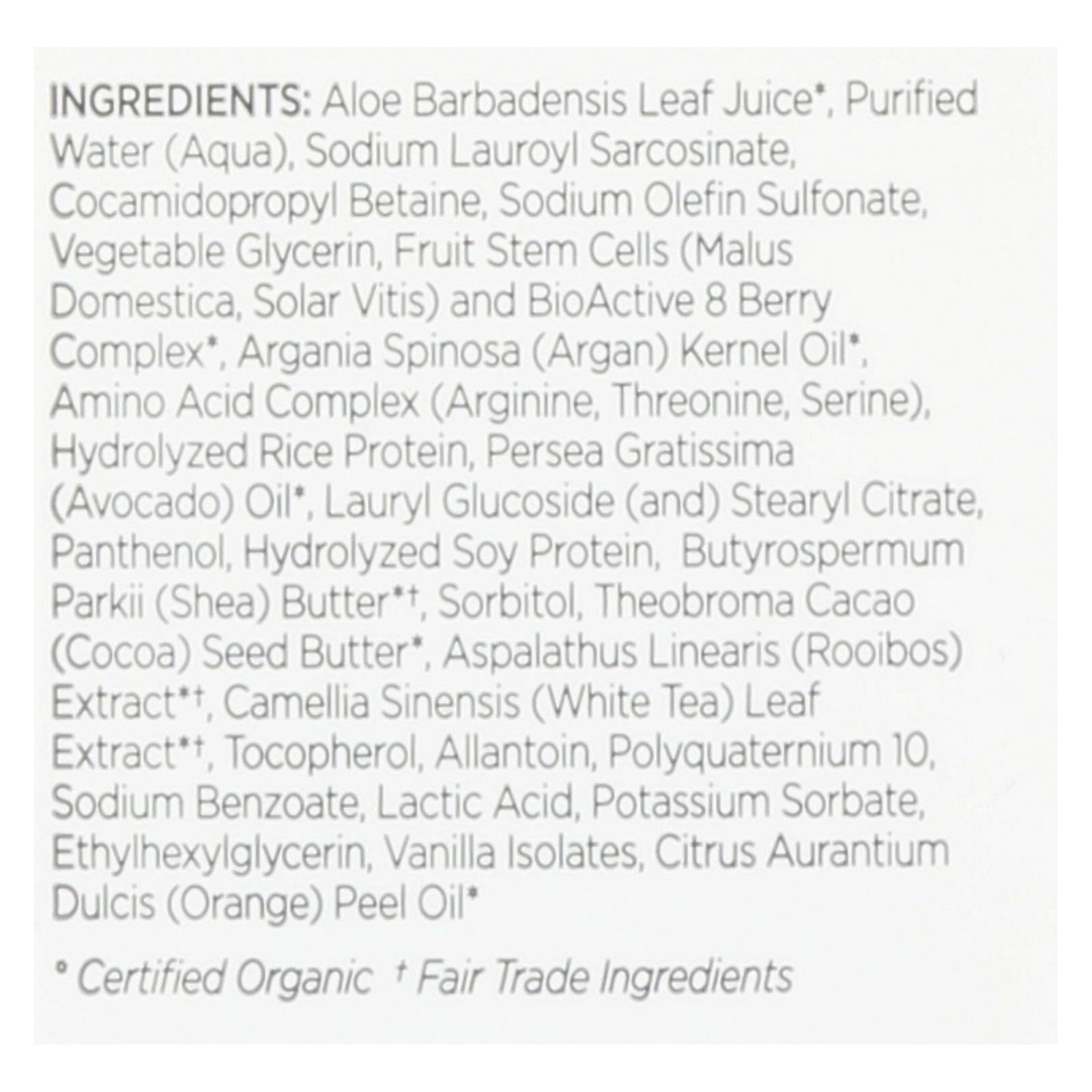 ingredients : aloe barbadensis leaf juice;purified water;aqua;sodium lauroyl sarcosinate;cocamidopropyl betaine;sodium olefin sulfonate;vegetable glycerin;fruit stem cells;malus domestica;solar vitis;and bioactive 8 berry complex;argania spinosa;argan;kernel oil;amino acid complex;arginine;threonine;serine;hydrolyzed rice protein;persea gratissima;avocado;oil;lauryl glucoside;and;stearyl citrate;panthenol;hydrolyzed soy protein;butyrospermum parkii;shea;butter*†;sorbitol;theobroma cacao;cocoa;seed butter;aspa