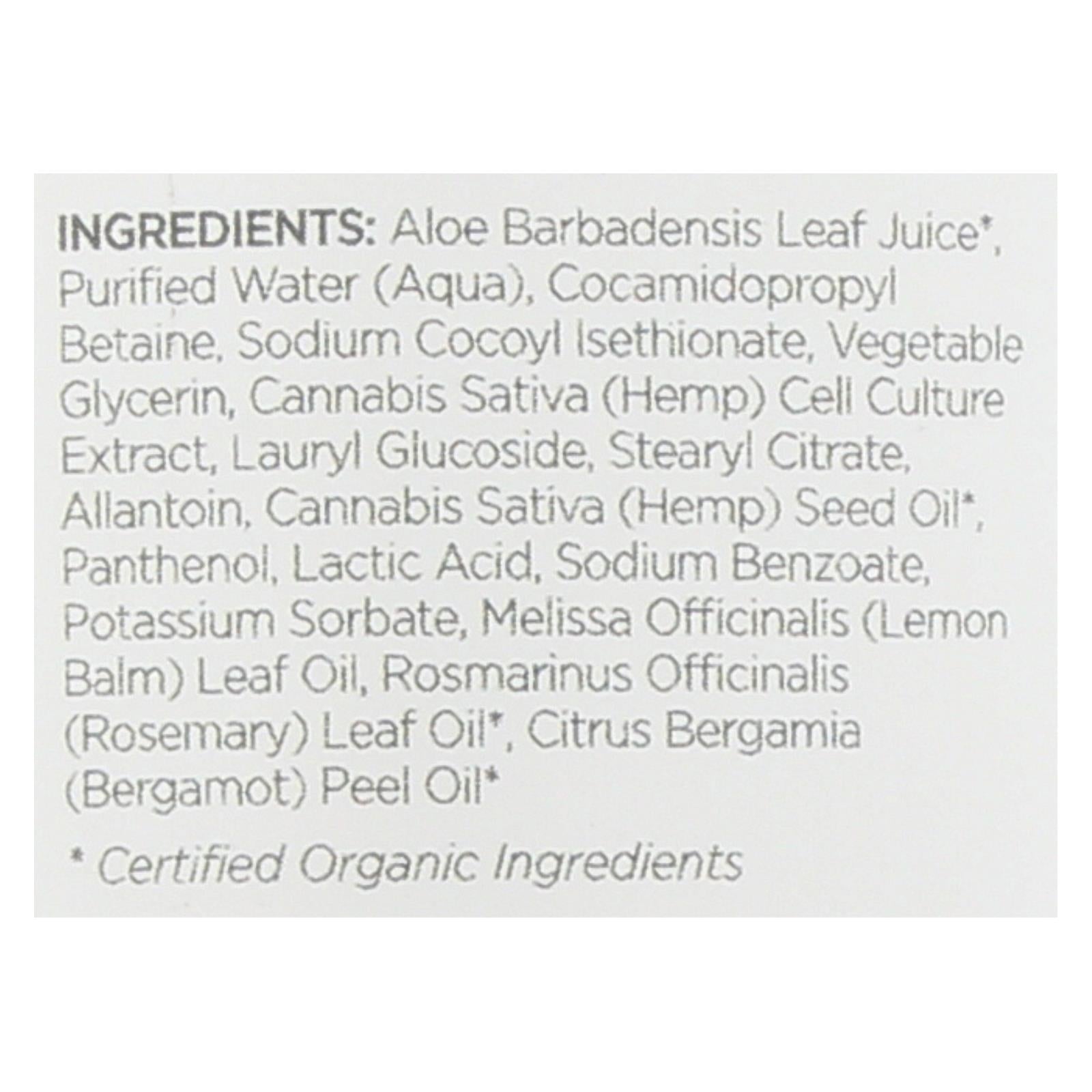 ingredients : aloe barbadensis leaf juice;purified water;aqua;cocamidopropyl betaine;sodium cocoyl isethionate;vegetable glycerin;cannabis sativa;hemp;cell culture extract;lauryl glucoside;stearyl citrate;allantoin;seed oil;panthenol;lactic acid;sodium benzoate;potassium sorbate;melissa officinalis;lemon balm;leaf oil;rosmarinus officinalis;rosemary;citrus bergamia;bergamot;peel oil