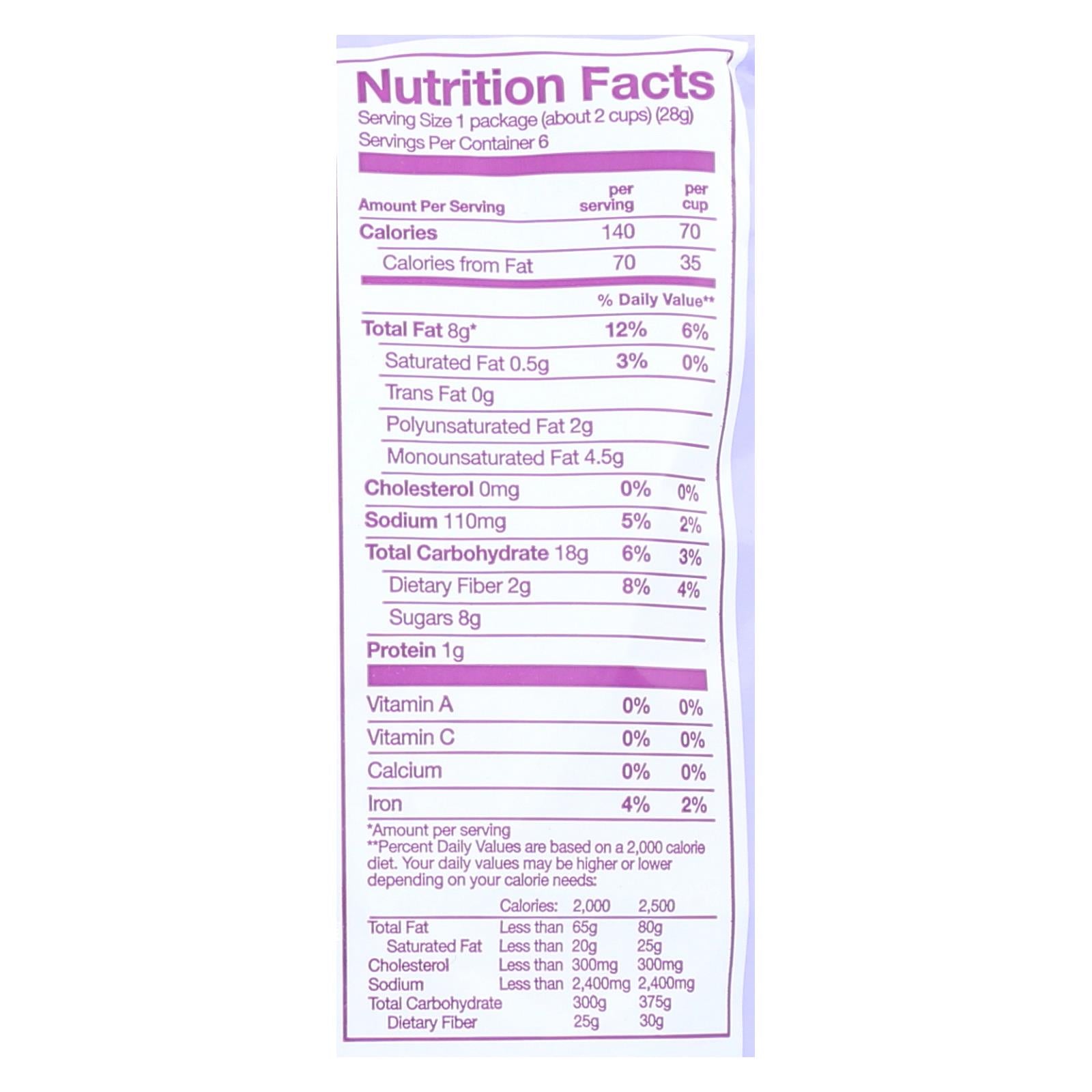 Angie's boomchickapop sweet & salty kettle corn is made with ingredients like popcorn, sunflower oil, cane sugar and sea salt. Our 6 pack bag contains six servings of about 1 oz. Each. Each serving contains 140 calories, 1 g of protein and 2 g. Of dietary fiber. Our snack popcorn contains zero trans fat and no high fructose corn syrup.