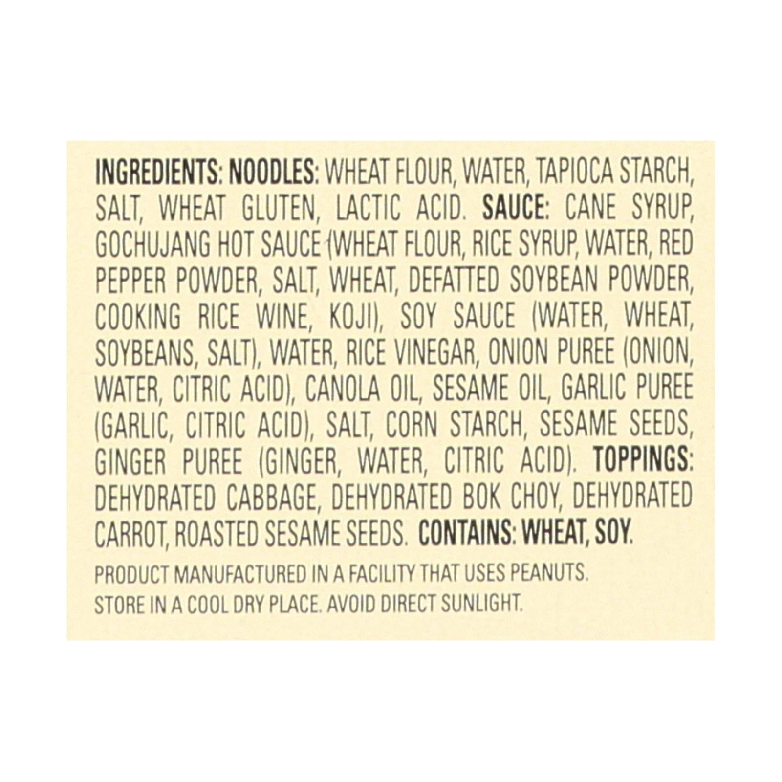 ingredients : noodles: wheat flour, water, tapioca starch, salt, wheat gluten, lactic acid;sauce: cane syrup, gochujang hot sauce (wheat flour, rice syrup, water, red pepper powder, salt, wheat, defatted soybean powder, cooking rice wine, koji), soy sauce (water, wheat, soybeans, salt), water, rice vinegar, onion puree (onion, water, citric acid), canola oil, sesame oil, garlic puree (garlic, citric acid), salt, corn starch, sesame seeds, ginger puree (ginger, water, citric acid);toppings: dehydrated cabbage,
