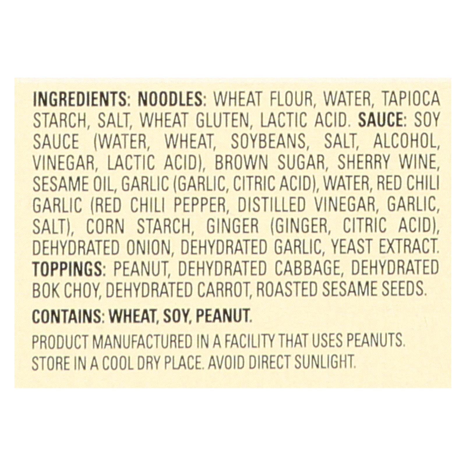 ingredients : hokkien noodles: water, wheat flour, modified tapioca starch, less than 2% of salt, wheat gluten, lactic acid, sauce: water, soy sauce (water, soybeans, wheat, salt), brown sugar, garlic puree, modified corn starch, less than 2% of ginger puree (ginger, water), sesame oil, caramel color, spices, yeast extract, citric acid, xanthan gum, peanuts: dry roasted peanuts, toppings: dehydrated cabbage, dehydrated bok choy, dehydrated carrot, roasted sesame seeds, glucose.