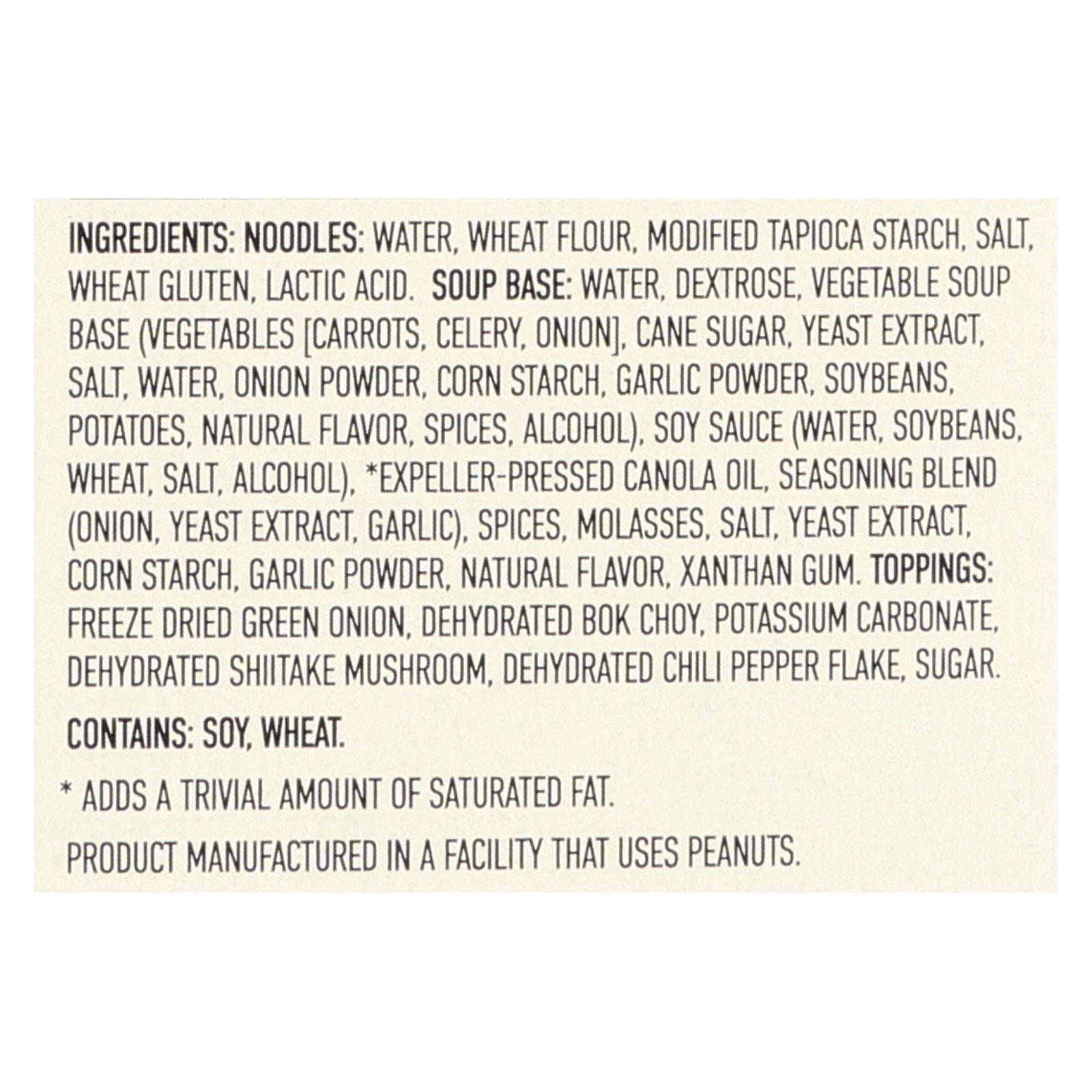 ingredients : noodles: water, wheat flour, modified tapioca starch, salt, wheat gluten, lactic acid;soup base: water, dextrose, vegetable soup base (vegetables [carrots, celery, onion], cane sugar, yeast extract, salt, water, onion powder, corn starch, garlic powder, soybeans, potatoes, natural flavor, spices, alcohol), soy sauce (water, soybeans, wheat, salt, alcohol), *expeller-pressed canola oil, seasoning blend (onion, yeast extract, garlic), spices, molasses, salt, yeast extract, corn starch, garlic powd