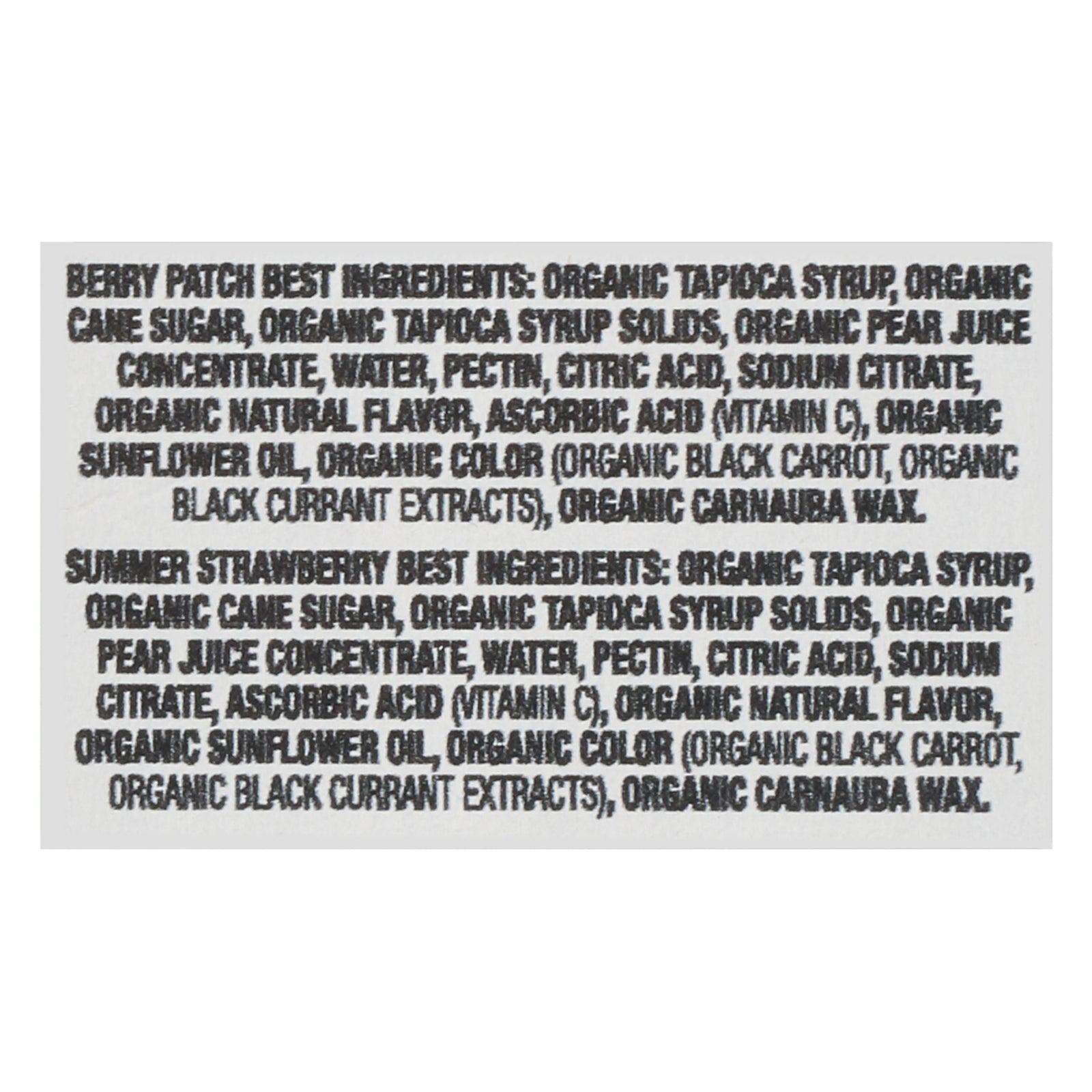 ingredients : berry patch: organic rice syrup, organic cane sugar, organic tapioca syrup solids, water, organic pear juice concentrate, pectin, citric acid, sodium citrate, ascorbic acid (vitamin c), organic natural flavor, organic sunflower oil, organic color (organic black carrot, organic black currant extracts), organic carnauba wax;summer strawberry: organic rice syrup, organic cane sugar, organic tapioca syrup solids, water, organic pear juice concentrate, pectin, citric acid, sodium citrate, ascorbic ac