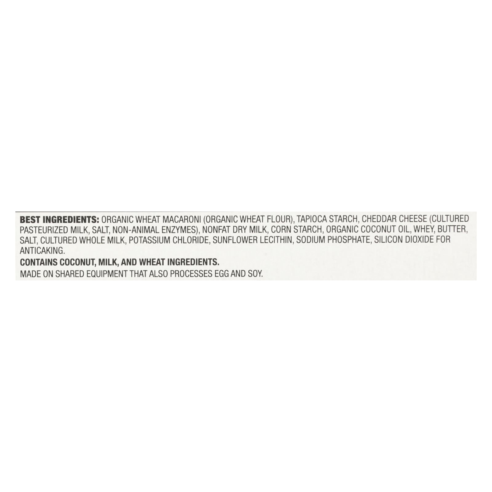 ingredients : organic wheat macaroni;organic wheat flour;tapioca starch;cheddar cheese;cultured pasteurized milk;salt;non-animal enzymes;nonfat dry milk;corn starch;organic coconut oil;whey;butter;cultured whole milk;potassium chloride;sunflower lecithin;sodium phosphate;silicon dioxide for anticaking
