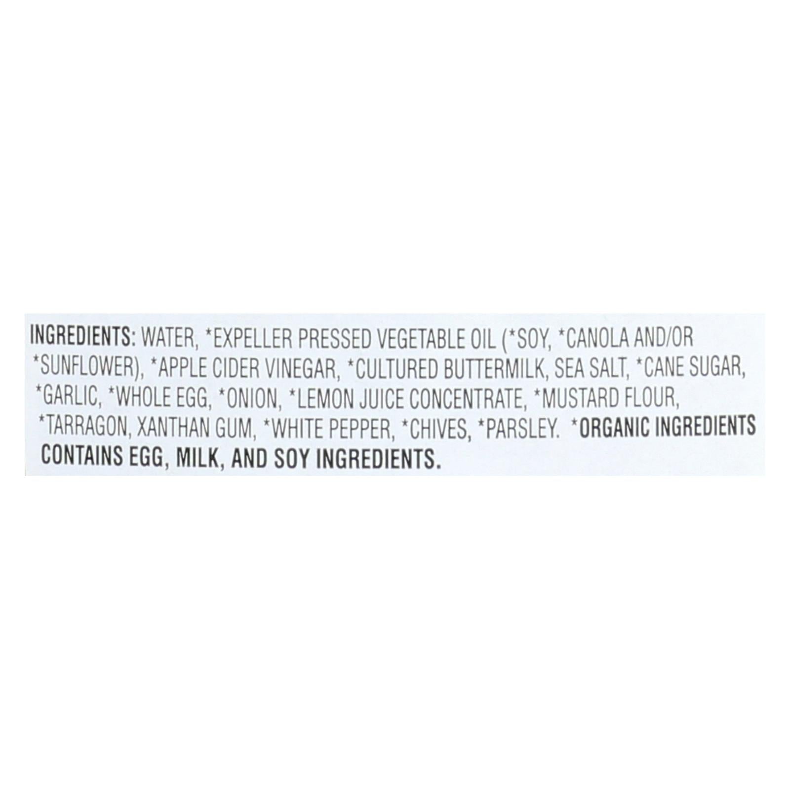 ingredients : water;expeller-pressed canola oil;apple cider vinegar;expeller-pressed soybean oil;sea salt;buttermilk;cane sugar;dried garlic;whole egg;dried onion;lemon juice concentrate;mustard seed;xanthan gum;dried tarragon;skim milk;dried chives;white pepper;dried parsley