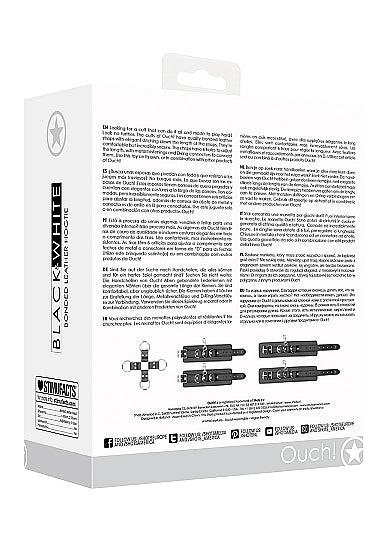 Best Fetish Brand of the Year Black and White Hogtie with Hand and Ankle Cuffs Bonded Leather from Shots Toys America. Looking for a cuff that can do it all and made to play hard? Look no further. The cuffs of Ouch! have quality leather straps with elegant stitching down the length of the straps, They are comfortable but incredibly secure. The straps have 6 holes to adjust the length. with metal fastenings and D-ring connectors to connect them. Use this toy on its own, or in combination with other products of Ouch!