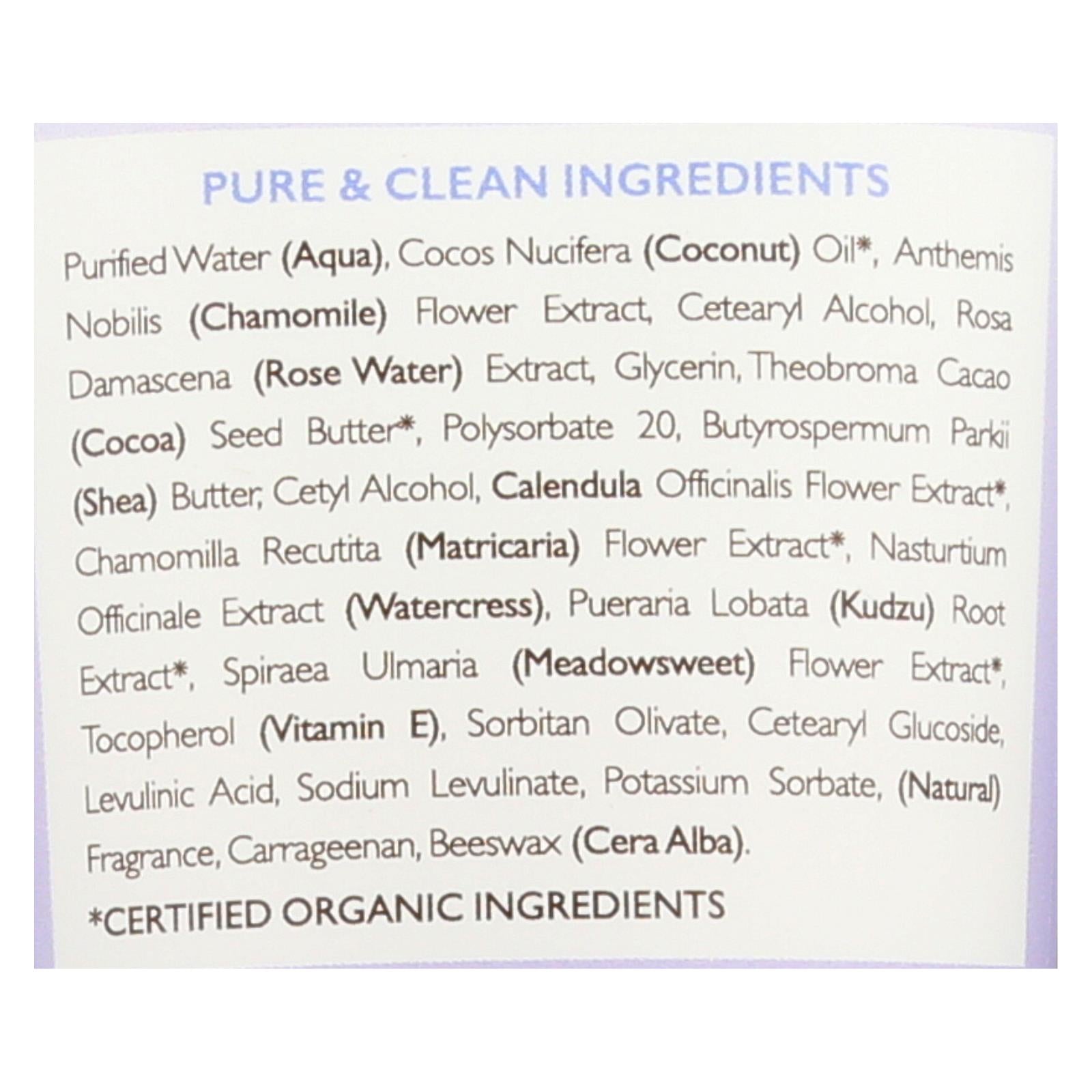 ingredients : pure & clean purified water;aqua;cocos nucifera;coconut;oil;anthemis nobilis;chamomile;flower extract;cetearyl alcohol;rosa damascena;rose water;extract;glycerin;theobroma cacao;cocoa;seed butter;polysorbate 20;butyrospermum parkii;shea;butter;calendula officinalis flower extract;chamomila recutita;matricaria;nasturtium officinale extract;watercress;pueraria lobata;kudzu;root extract;spiraea ulmaria;meadowsweet;tocopherol;vitamin e;sorbitan olivate;cetearyl glucoside;levulinic acid;sodium l