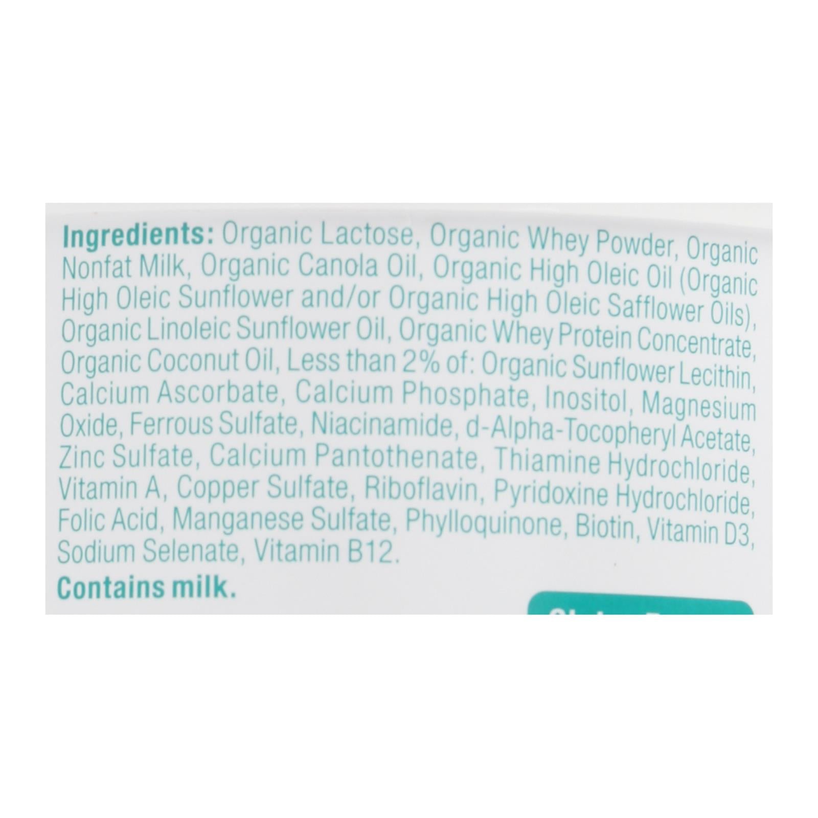 ingredients : organic lactose;organic nonfat milk;organic high oleic oil (organic high oleic sunflower and/or organic high oleic safflower oils);organic soybean oil;organic whey protein concentrate;organic coconut oil;less than 2% of: organic soy lecithin, calcium carbonate, calcium phosphate, sodium chloride, potassium chloride, potassium citrate, magnesium phosphate, choline bitartrate, calcium ascorbate, inositol, ferrous sulfate, d-alpha tocopheryl acetate, zinc sulfate, niacinamide, calcium pantothenate,