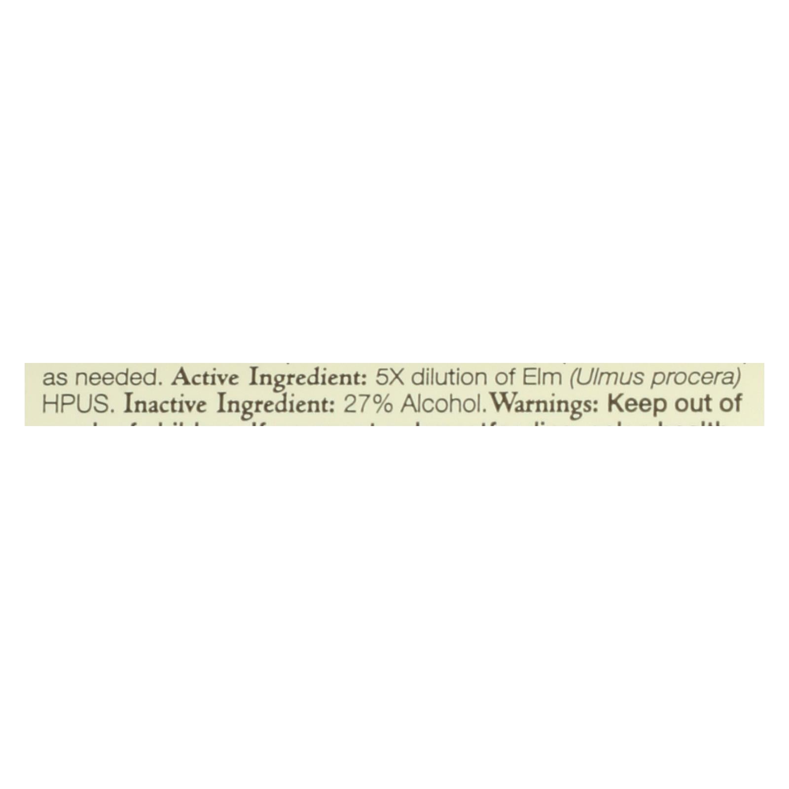 ingredients : active ingredient: 5x dilution of elm;ulmus procera;hpus. Inactive ingredient: 27% alcohol