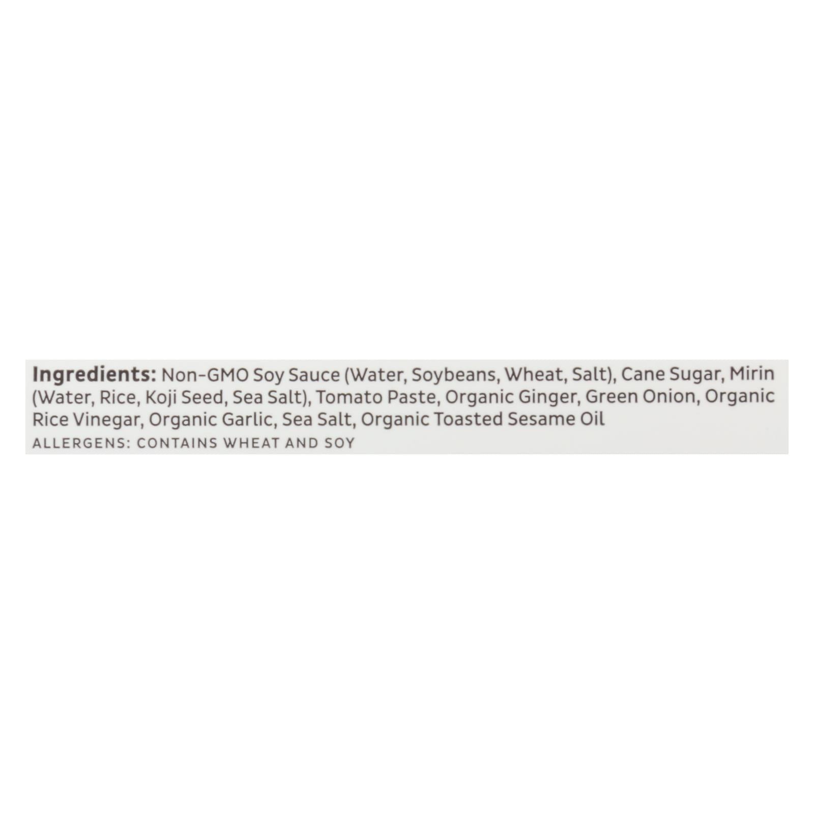 ingredients : non-gmo soy sauce;water;soybeans;wheat;salt;cane sugar;mirin;rice;koji seed;sea salt;tomato paste;organic ginger;green onion;organic rice vinegar;organic garlic;organic toasted sesame oil