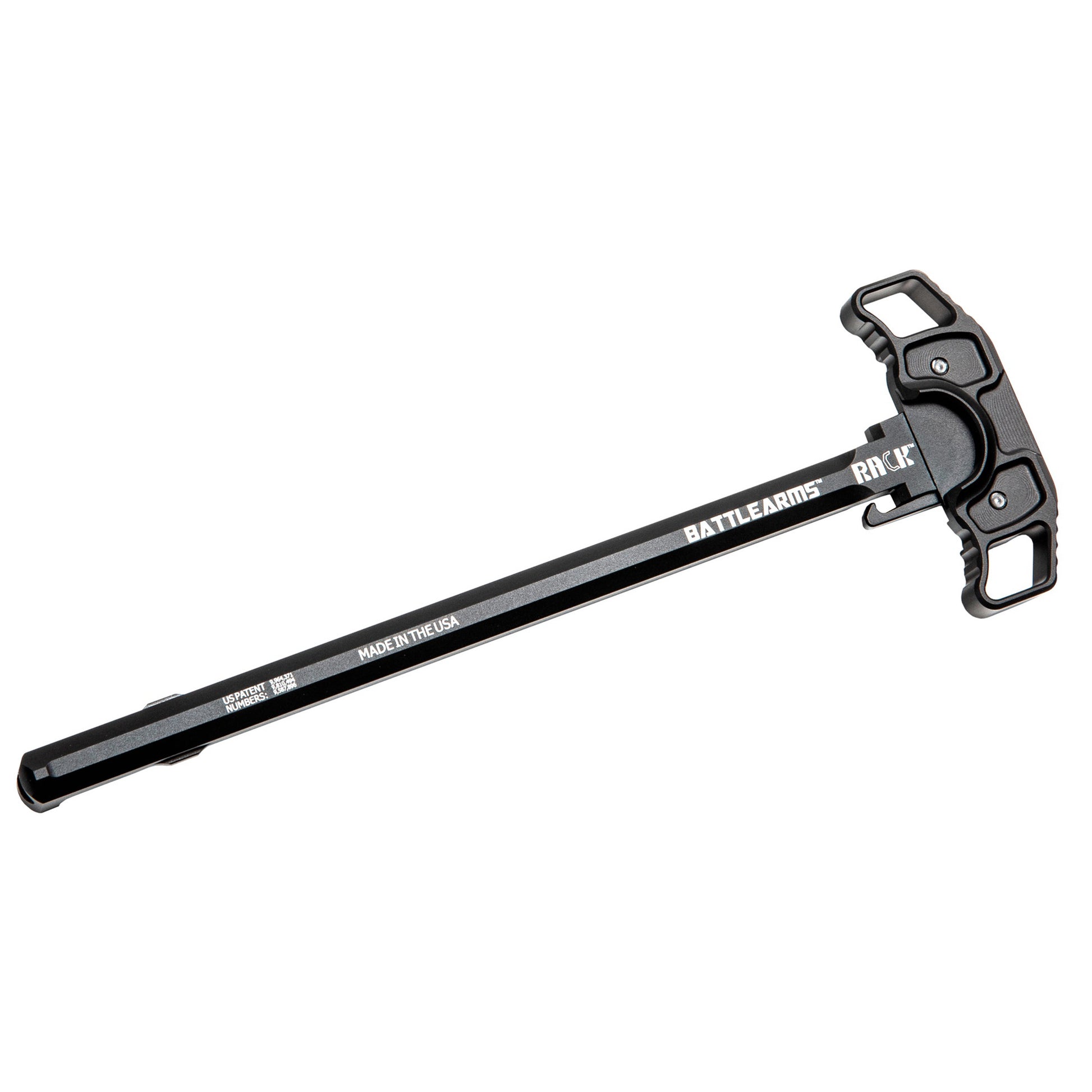 The RACK Ambidextrous Charging Handle was developed by BATTLEARMS to be the finest charging handle ever produced! It is the toughest available for the AR-15" AR-10 and 9mm AR PCC platforms. The RACK charging handle is simplicity at its best with only three major components. Unlike other charging handles, the RACK makes no contact with the sides of the receiver preventing wear on the receiver and charging handle. Not only is it fast, buttery smooth, it also minimizes wear to the upper receiver with its side-sliding unlocking action. The RACK is no doubt the new heavyweight champion among all other ambidextrous charging handles. Engineered to withstand the abuse of downrange use!