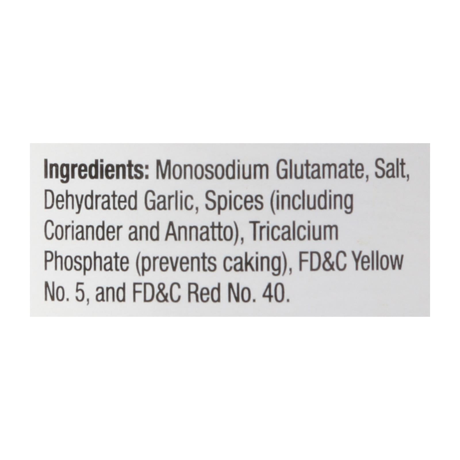 ingredients : monosodium glutamate;salt;dehydrated garlic;spices (including coriander and annatto);tricalcium phosphate (prevents caking);fd&c yellow no;5;and fd&c red no;40