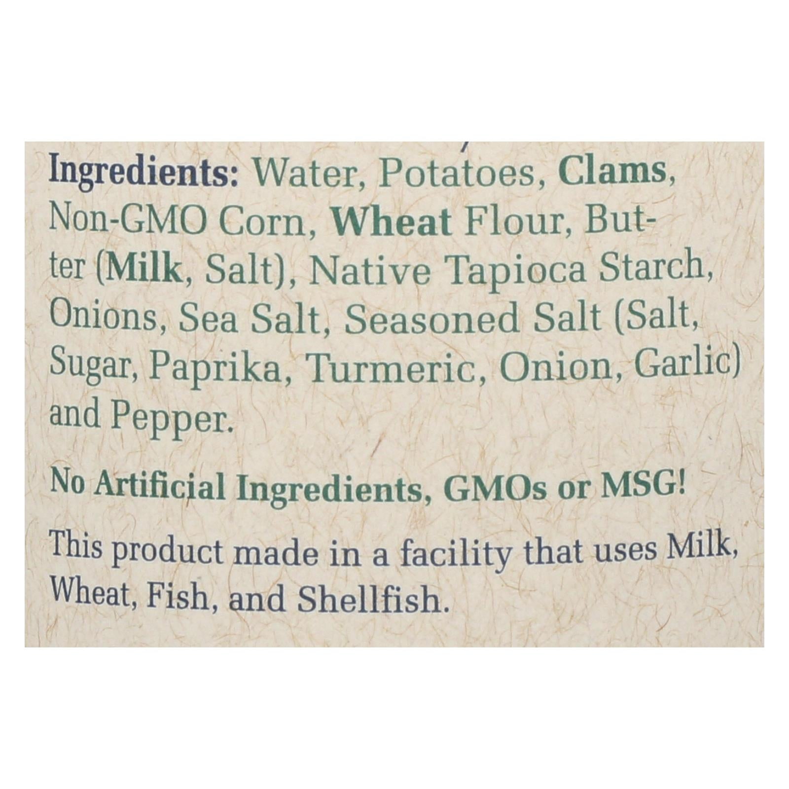 ingredients : water;potatoes;clams;non-gmo corn;wheat;flour;butter;milk;salt;native tapioca starch;onions;sea salt;seasoned salt;sugar;paprika;turmeric;onion;garlic;and pepper