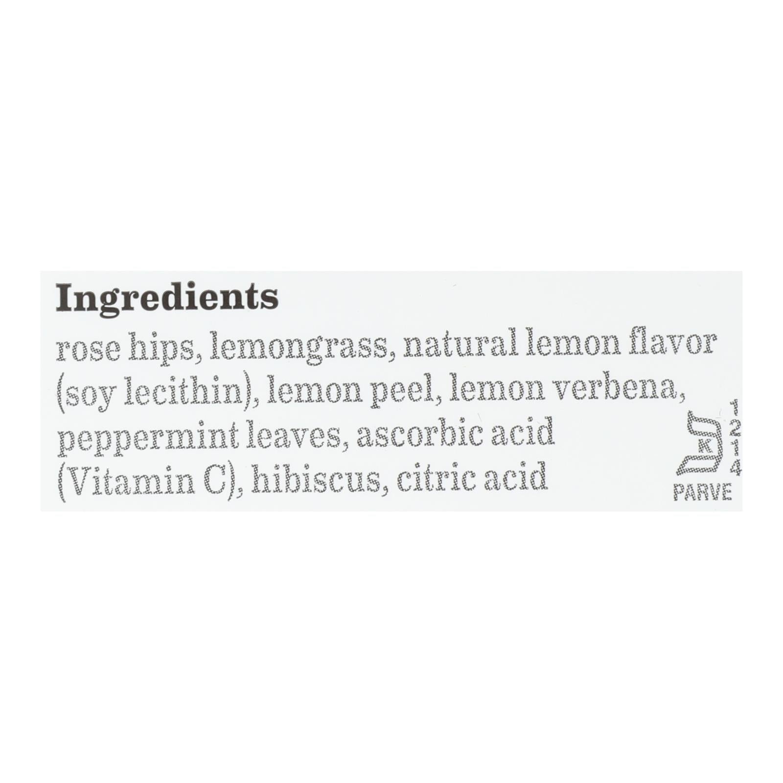 ingredients : rose hips;lemongrass;natural lemon flavor;soy lecithin;lemon peel;lemon verbena;peppermint leaves;ascorbic acid;vitamin c;hibiscus;citric acid