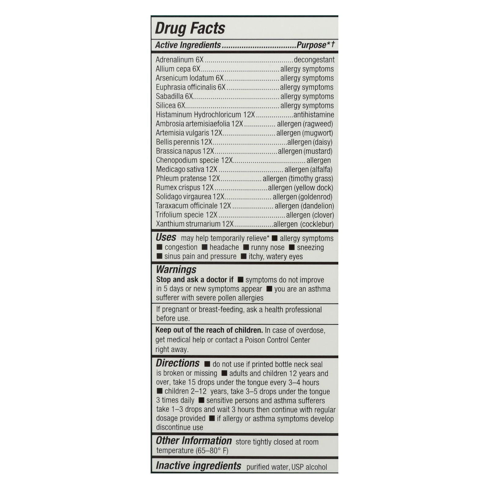 ingredients : adrenalinum 6x purpose*† decongestant allium cepa 6x purpose*† allergy symptoms arsenicum lodatum 6x purpose*† allergy symptoms euphrasia officinalis 6x purpose*† allergy symptoms sabadilla 6x purpose*† allergy symptoms silicea 6x purpose*† allergy symptoms histaminum hydrochloricum 12x purpose*† antihistamine ambrosia artemisiaefolia 12x purpose*† allergen;ragweed;artemisia vulgaris 12x purpose*† allergen;mugwort;bellis perennis 12x purpose*† allergen;daisy;brassica napus 12x purpose*† allergen