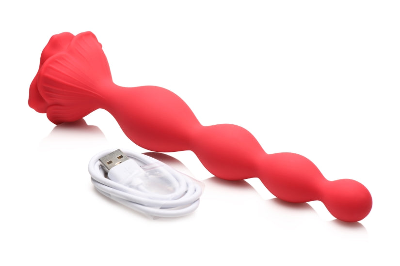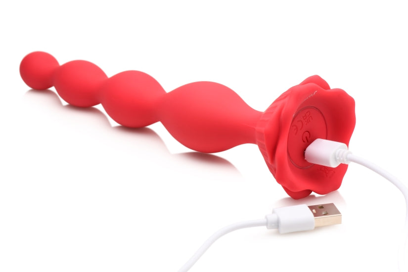 Bloomgasm Beaded Bloom 9X Rose Vibrator from XR Brands. Your backdoor pleasure is about to bloom with this Beaded Rose Vibrator! The smooth, round, tapered tip makes insertion easy. Enjoy every one of the 4 graduated beads along the stem of this blossoming rose base! The flexible, beaded stem bends so it can compliment your inner curves. Add even more stimulation by choosing any one of the 3 speeds and 6 patterns of powerful vibration that you can feel rumbling deep inside you! Made out of premium Silicone, this toy is silky smooth, plush, phthalate free and body safe. Use only with water based lubricants. Rated as IPX6, it is waterproof and can handle high pressure jets so you can take it in the shower with you! However, do not submerge it under water. After playing with it, remove it and wash it with warm water and mild soap, then rinse it and spray it with a toy cleaner. Recharge using the magnetic USB cable provided so it is fully charged for next time! Turn the sex toy on and grab some lube. As you relax yourself through touching, kissing, or playing with yourself or your partner, place some lube on the tip of the stem. Leave the rest of the beads dry so you can easily hold on and keep your grip. As you pop the first bead in, add more lube and slowly work your way up to a larger size. If you do not get them all inside the first time, that is okay! You will have a goal for next time and can work your way up. The vibrations will feel amazing and stimulate you from inside! Measurements: overall length 7.7 inches. Insertable length 6.4 inches. Smallest bead diameter 0.75 inch. Largest bead diameter 1.25 inches. Materials: Silicone, ABS Plastic. Color: Red. Note: please do not use with Silicone based lubricants. Do not charge while inserted. Key features Beaded Bloom Rose: this blooming Rose has 4 graduated beads of backdoor pleasure along its stem! Enjoy as they stimulate your booty! Powerful vibration: 3 speeds and 6 patterns of vibration that you can feel rumbling in your derriere. Flexible Silicone: this silky smooth, phthalate free Silicone is body safe and flexible with a tapered tip that allows for easier insertion! Enjoy how it slides inside and bends with your curves! Rechargeable. Waterproof rated IPX6 waterproof means it can handle high pressure water jets but should not be submerged underwater. Recharge using the magnetic USB cable provided. Categories: Anal Toys, Valentine's Day Gift, Sex Toys for Couples, Men, Women, Eco-Friendly Sex Toys, Rechargeable Vibrators, Anal Beads. 2024.