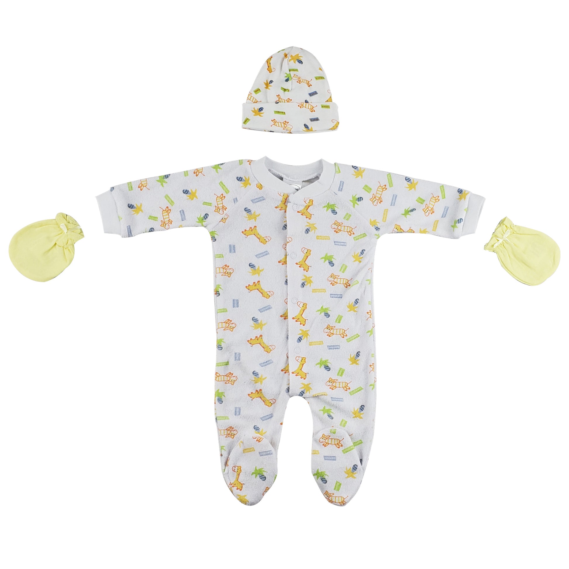 Terry Sleep 'n Play (Small 0-3M) (80% Cotton / 20% Polyester Terry), Printed Baby Cap (100% Cotton), Yellow Infant Mittens (Jersey)