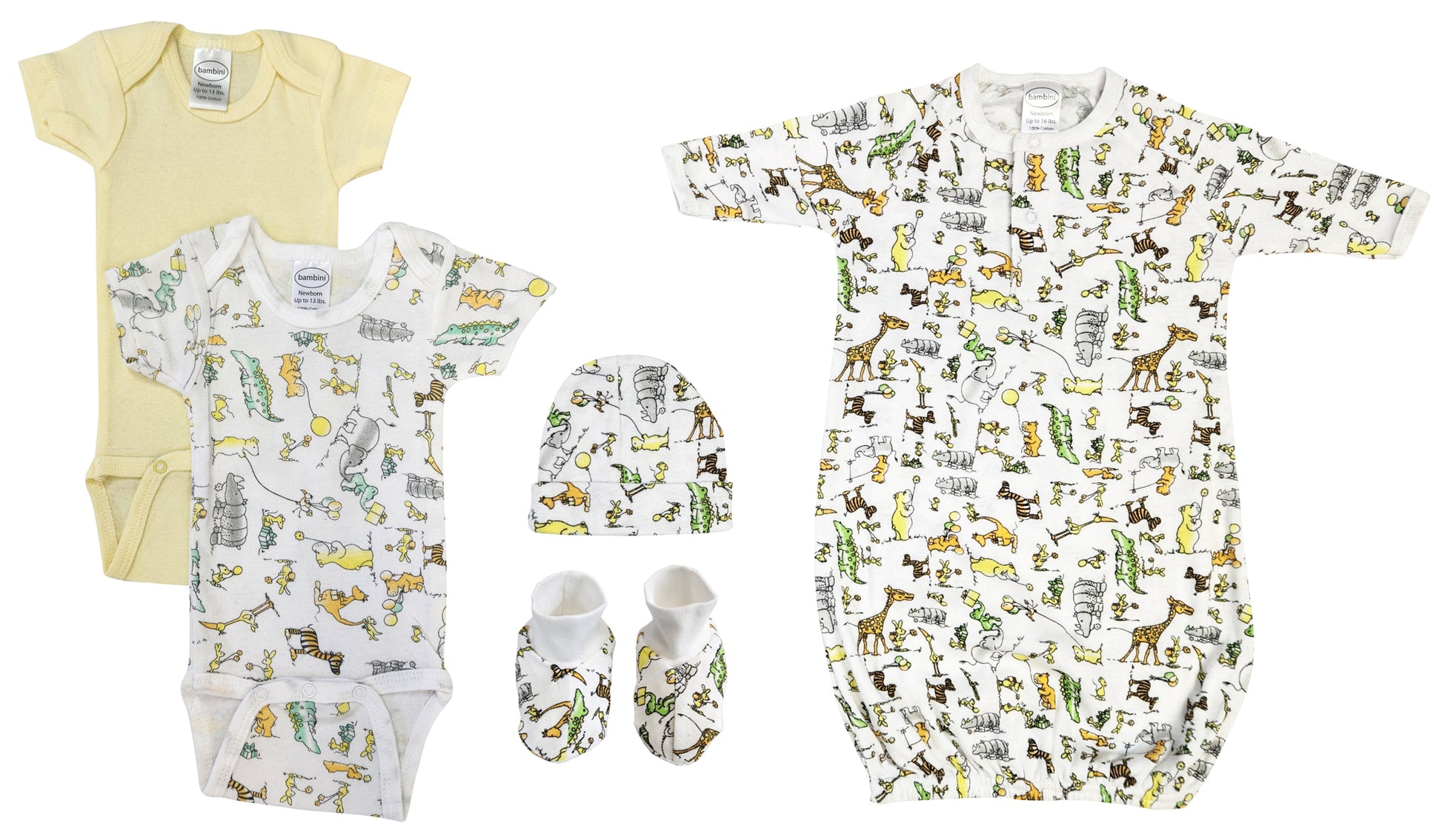 3 pc Baby Gift Set (100% Cotton), Yellow Short Sleeve Onezies (100% Cotton), Unisex Print Gown (100% Cotton)