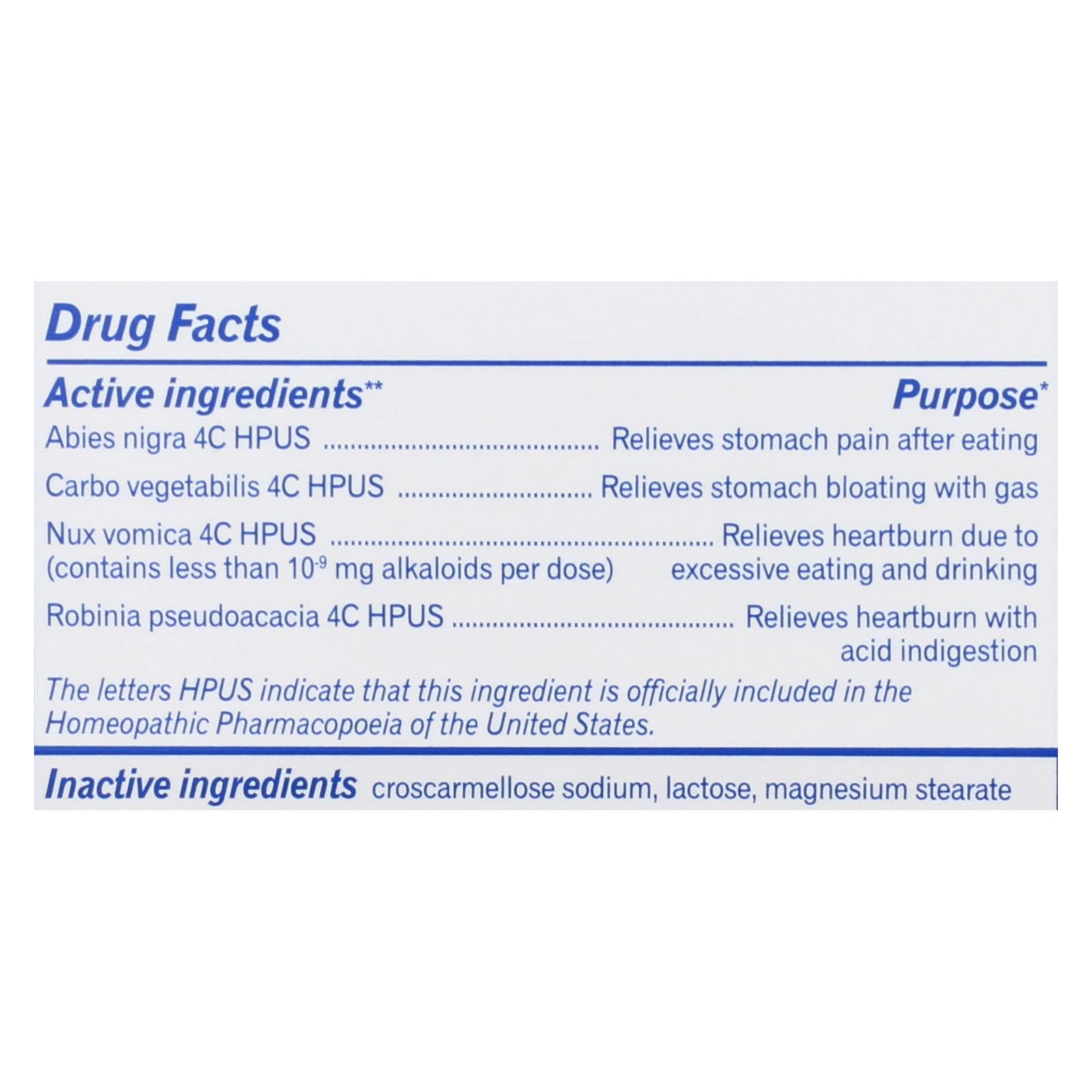 ingredients : active ** abies nigra 4c hpus purpose* relieves stomach pain after eating carbo vegetabilis 4c hpus purpose* relieves stomach bloating with gas nux vomica 4c hpus;contains less than 10-9 mg alkaloids per dose;purpose* relieves heartburn due to excessive eating and drinking robinia pseudoacacia 4c hpus purpose* relieves heartburn with acid indigestion inactive croscarmellose sodium;lactose;magnesium stearate