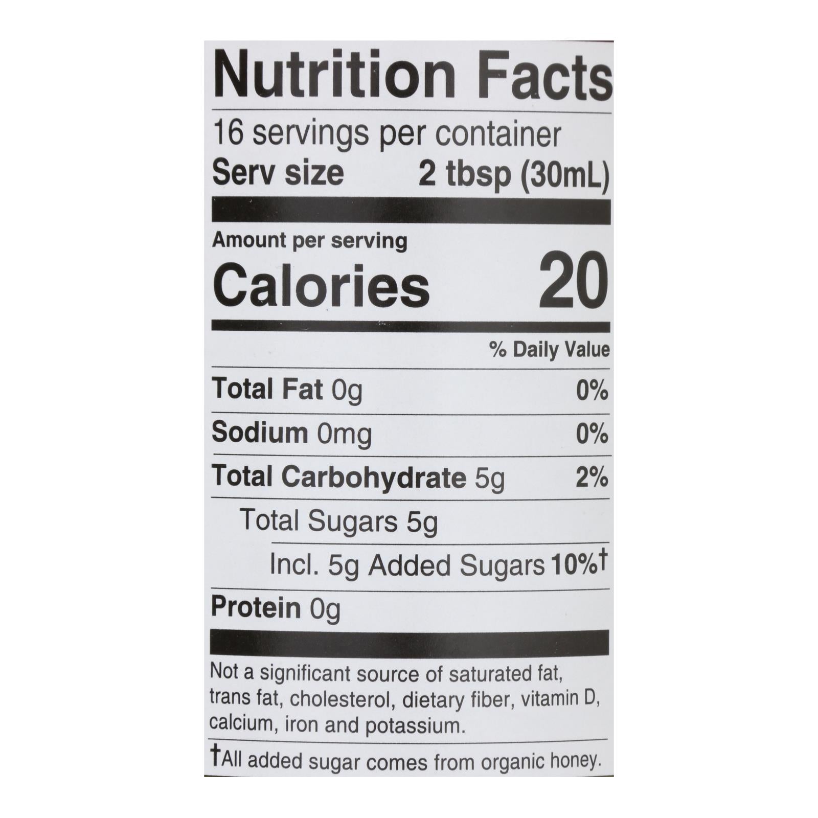 ingredients : organic apple cider vinegar;organic honey;organic lemon juice;organic lime juice;water;organic ginger puree;natural grapefruit flavor;natural orange flavor;organic ginger extract;organic stevia extract