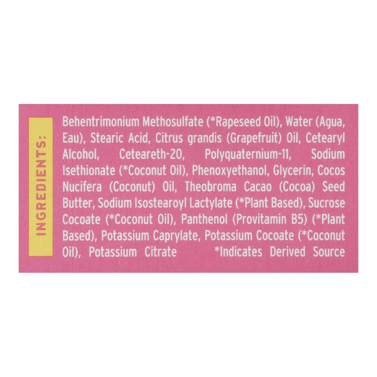 ingredients : behentrimonium methosulfate (*rapeseed oil);water (agua, eau);stearic acid;citrus grandis (grapefruit) oil;cetearyl alcohol;ceteareth-20;polyquaternium-11;sodium isethionate (*coconut oil);phenoxyethanol;glycerin;cocos nucifera (coconut) oil;theobroma cacao (cocoa) seed butter;sodium isostearoyl lactylate (*plant based);sucrose cocoate (*coconut oil);panthenol (provitamin b5) (*plant based);potassium caprylate;potassium cocoate (*coconut oil);potassium citrate