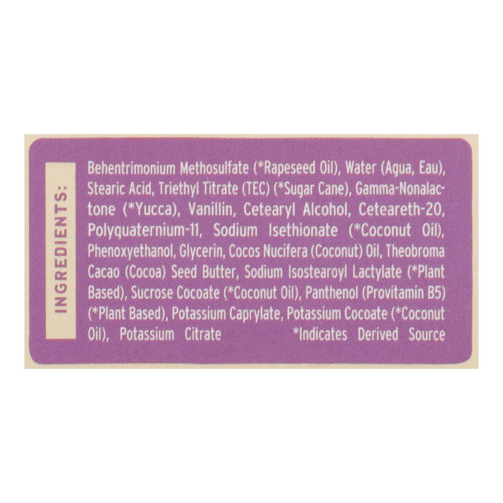 ingredients : behentrimonium methosulfate (*rapeseed oil);water (agua, eau);stearic acid;triethyl titrate (tec) (*sugar cane);gamma-nonalactone (*yucca);vanillin;cetearyl alcohol;ceteareth-20;polyquaternium-11;sodium isethionate (*coconut oil);phenoxyethanol;glycerin;cocos nucifera (coconut) oil;theobroma cacao (cocoa) seed butter;sodium isostearoyl lactylate (*plant based);sucrose cocoate (*coconut oil);panthenol (provitamin b5) (*plant based);potassium caprylate;potassium cocoate (*coconut oil);potassium ci