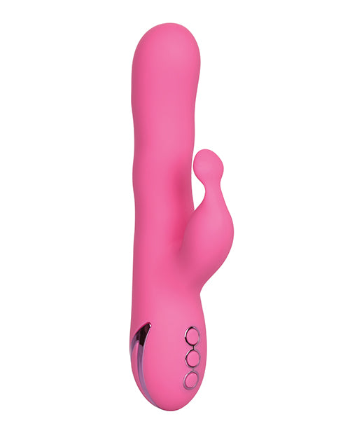 California Dreaming Santa Barbara Surfer Pink Vibrator from California Exotic Novelties. If you thought the Coast of Santa Barbara had some waves, wait until you see the California Dreaming Santa Barbara Surfer. This incredibly unique wave function moves up and down the shaft in a way that is sure to take you to some beautiful places. As the powerful shaft motor sends ripples at three adjustable speeds to your most sensitive areas, the flickering teaser ensures a full coverage experience, providing 10 functions of independent vibration, pulsation, and escalation in the attached external stimulator. This adult toy is great for solo play or as a couples and is made of body-safe silicone for maximum sexual wellness. The massager comes with a state of the art memory chip which will resume your favorite last used setting upon powering up, and includes a three second press travel lock, ensuring that things do not get started without you. The 4.75 inches shaft of the California Dreaming Santa Barbara Surfer is rechargeable in just 2.5 hours and runs for 40 minutes on high speed and 2.5 hours on low, giving adults the sexual pleasure they are seeking and the power they deserve.