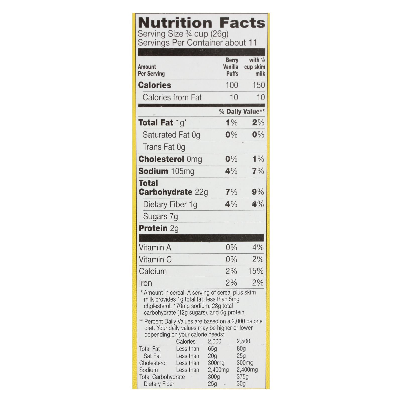 Cascadian farms lightly sweetened natural berry flavored yellow corn puffs are a healthy and delicious breakfast option. Made primarily with natural ingredients, this cereal is largely free of unnatural and unnecessary additives. This product is kosher, whole-grain and non-gmo. Each box of cascadian farms lightly sweetened natural berry flavored yellow corn puffs weighs 10.25 oz. With 11 servings per box and 100 calories per serving. See nutrition facts panel for allergens.