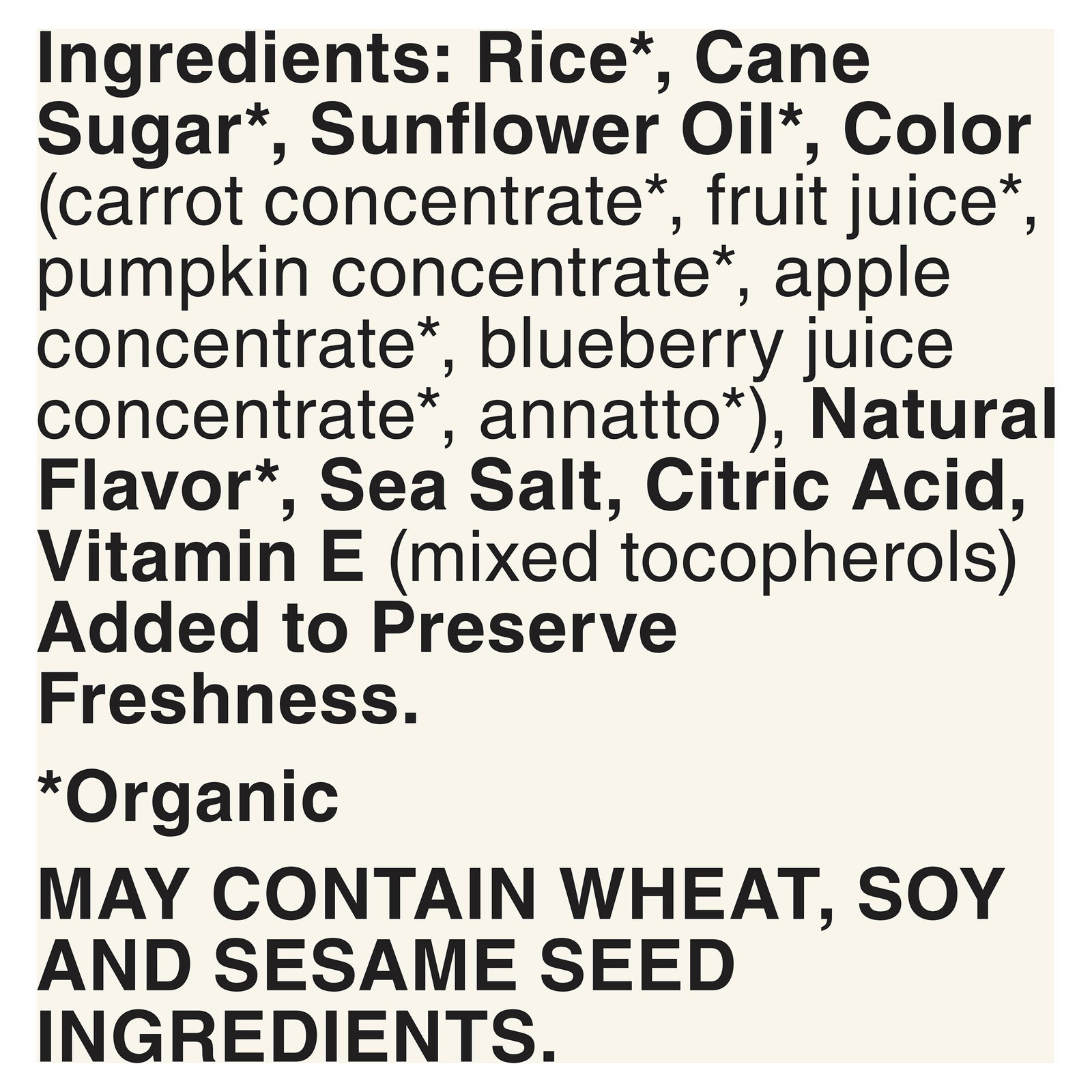 ingredients : rice;cane sugar;sunflower oil;color (carrot concentrate*, fruit juice*, pumpkin concentrate*, apple concentrate*, blueberry juice concentrate*, annatto*);natural flavor;sea salt;citric acid;vitamin e (mixed tocopherols) added to preserve freshness