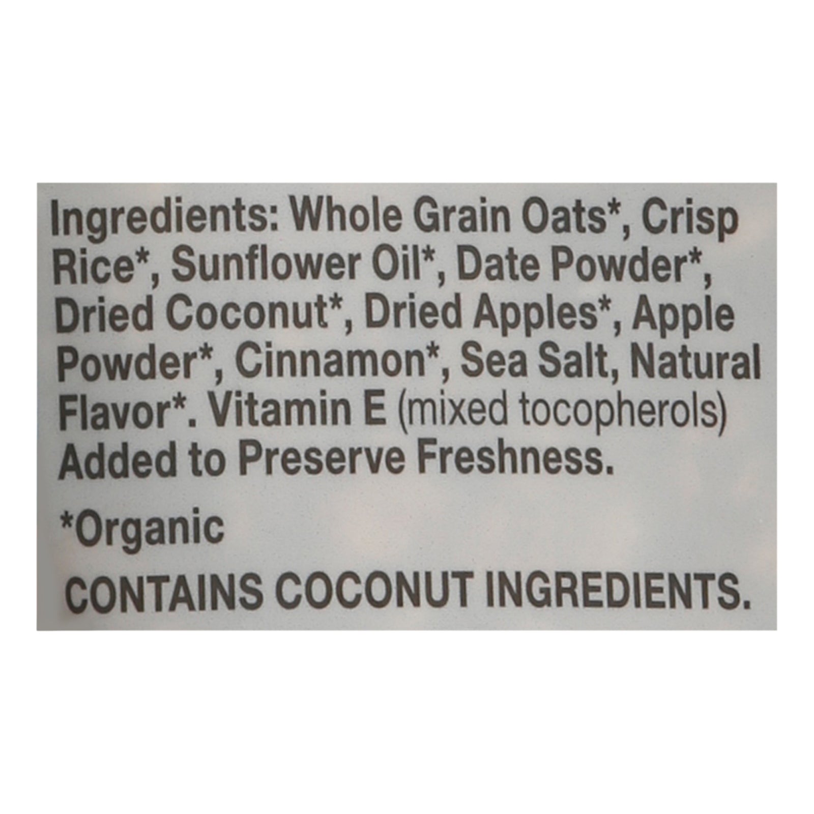 ingredients : whole grain oats;crisp rice;sunflower oil;date powder;dried coconut;dried apples;apple powder;cinnamon;sea salt;natural flavor