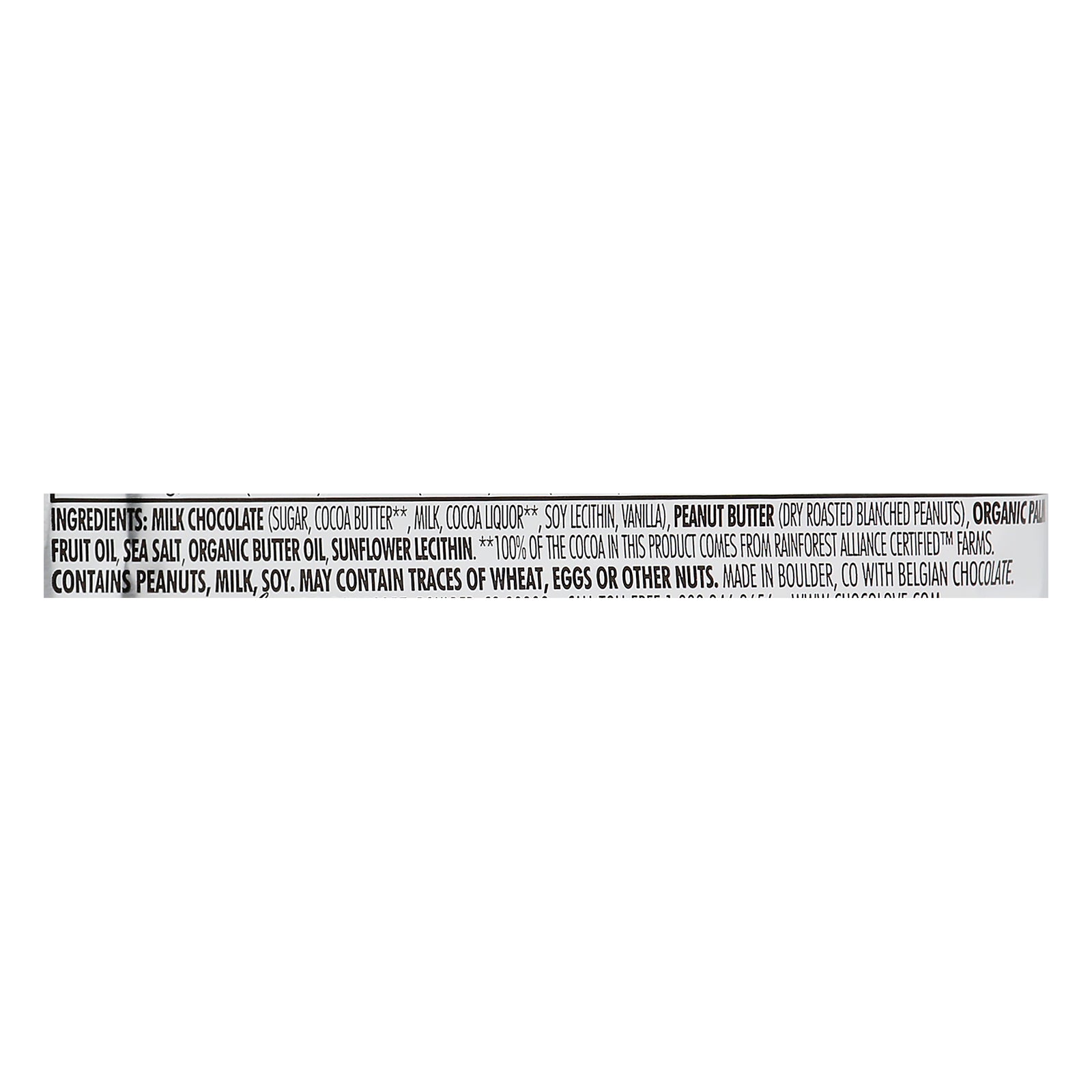 ingredients : milk chocolate (sugar, cocoa butter**, milk, cocoa liquor**, soy lecithin and/or sunflower lecithin, vanilla);peanut butter (dry roasted blanched peanuts);organic palm fruit oil;sea salt;organic butter oil;sunflower lecithin