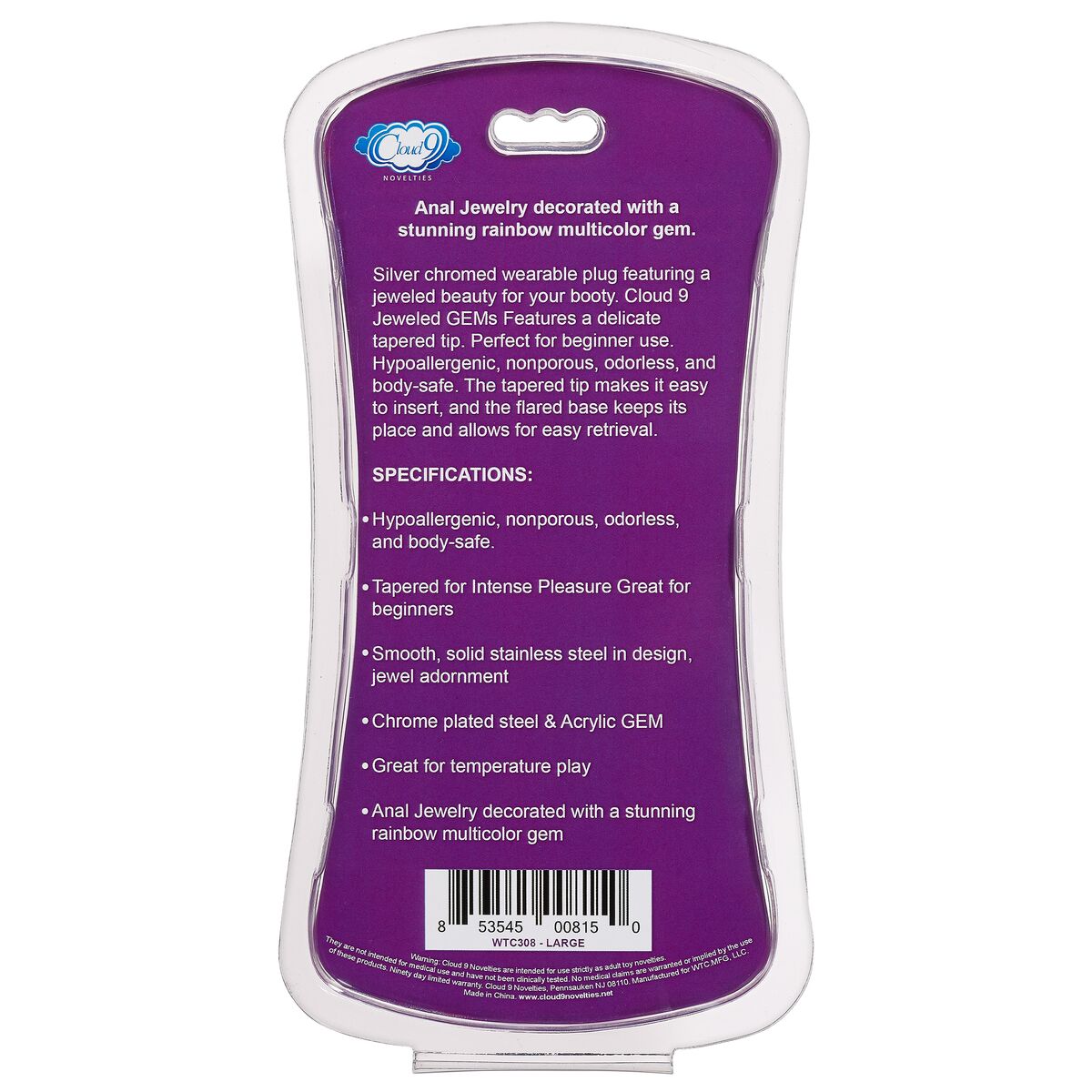 Features: a delicate tapered tip. Perfect for beginner use. Hypoallergenic, nonporous, odorless, and body safe. The tapered tip makes it easy to insert, and the flared base keeps its place and allows for easy retrieval. The sparkling jewel makes playtime fun. This Cloud 9 Jeweled Anal Plug is excellent for temperature play when you prepare it in hot or cold water. This Cloud 9 Gem anal plug is both visually stunning and ideal for stimulating anal play. Compatible with water based lubricants. Clean with mild soap and warm water after use. Smooth, solid stainless steel in design, jewel adornment. Chrome Plated Stainless Steel & Acrylic Gem. Great for temperature play. Anal Jewelry decorated with a stunning rainbow multicolor gem. Body safe Stainless Steel and Acrylic Gem. Great for temperature play Weight .43 pound. Height 5.11 inches, diameter 1.64 inches. 2020 Video.
