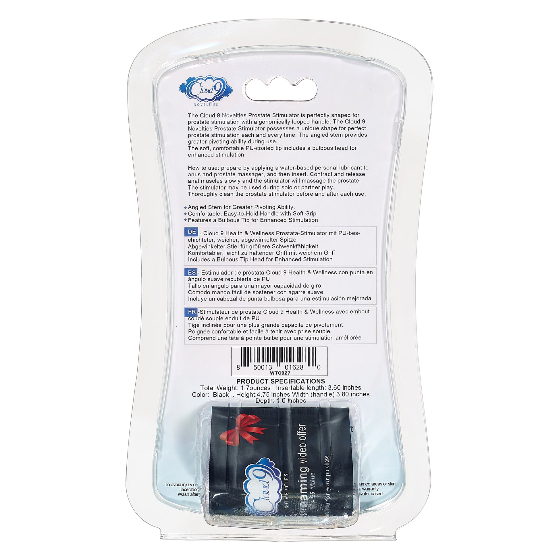 The Cloud 9 Novelties Prostate Stimulator is perfectly shaped for prostate stimulation with a convenient to use, ergonomically looped handle. The Cloud 9 Novelties Prostate Stimulator possesses a unique shape for perfect prostate stimulation each and every time. The angled stem provides greater pivoting ability during use. The soft, comfortable PU coated tip includes a bulbous head for enhanced stimulation. How to use: prepare by applying a water based personal lubricant to anus and prostate massager, and then insert. Contract and release anal muscles slowly and the stimulator will massage the prostate. The stimulator may be used during solo or partner play. Thoroughly clean the prostate stimulator before and after each use. Features: angled stem for greater pivoting ability. Comfortable, easy to hold handle with soft grip.