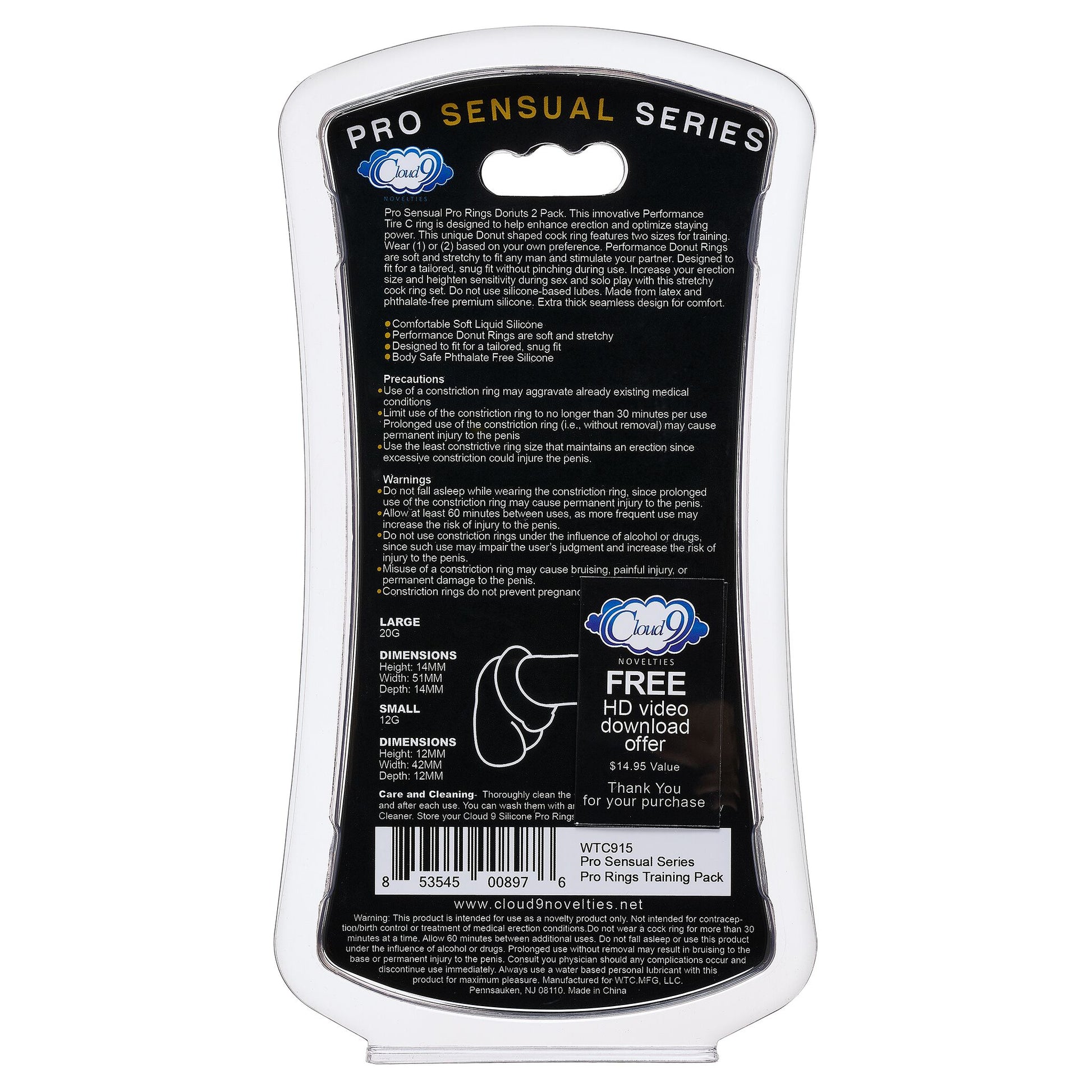 Cloud 9 Pro Sensual Pro Rings Donuts 2 Pack. This innovative Performance Donut Cock ring is designed to help enhance erection and optimize staying power. This unique Donut shaped cock ring features two sizes for training. Wear one or two) based on your own preference. Performance Cock Rings are soft and stretchy to fit any man and stimulate your partner. Designed to fit for a tailored, snug fit without pinching during use. Increase your erection size and heighten sensitivity during sex and solo play with this stretchy cock ring set. Do not use silicone-based lubes. Made from latex and phthalate free premium silicone. Extra thick seamless design for comfort.