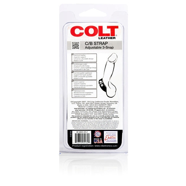 COLT Leather Cock and Ball Adjustable 3 Snap Cock Strap is soft and supple. High quality gear, hand double stitched plus secure snaps. For looks, for pleasure. Enjoy either way! Safe and pure for body and pleasure. Made using phthalate free, non-toxic materials Leather straps, Chromed Steel snaps. Cock Strap measures 9 inches long by .75 inch wide. Bulk weight .4 ounce. It is easy to clean with warm water and soap. Category: For Men, Rings & Sleeves, Rings. COLT Adjustable 3 Snap Leather Strap is a registered trademark for California Exotic Novelties. Sex Toys and sexual wellness. Made in the USA. Color Black. 16.