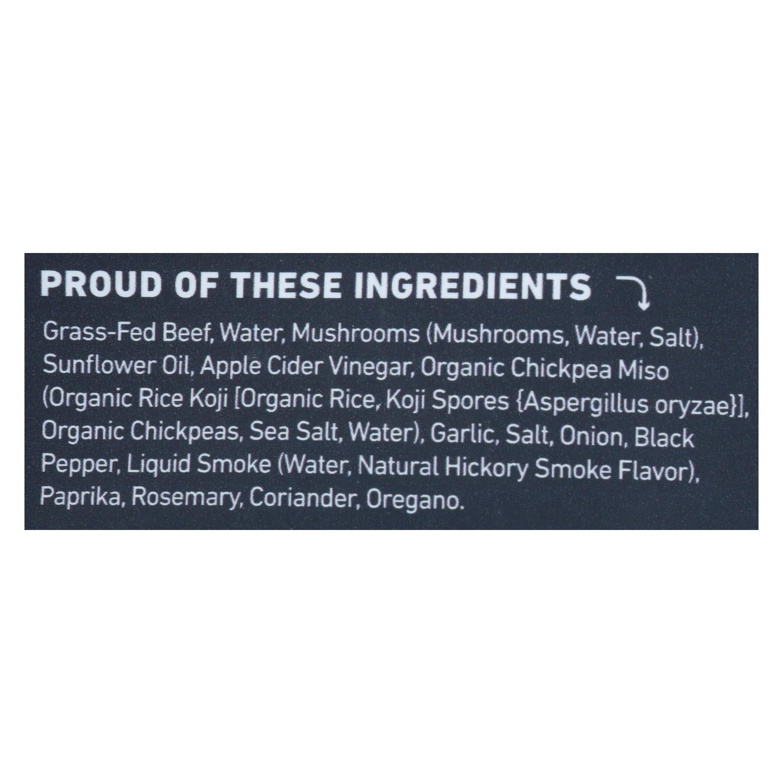 ingredients : grass-fed beef;water;mushrooms;salt;sunflower oil;apple cider vinegar;organic chickpea miso;organic rice koji [organic rice;koji spores {aspergillus oryzae}];organic chickpeas;sea salt;garlic;onion;black pepper;liquid smoke;natural hickory smoke flavor;paprika;rosemary;coriander;oregano