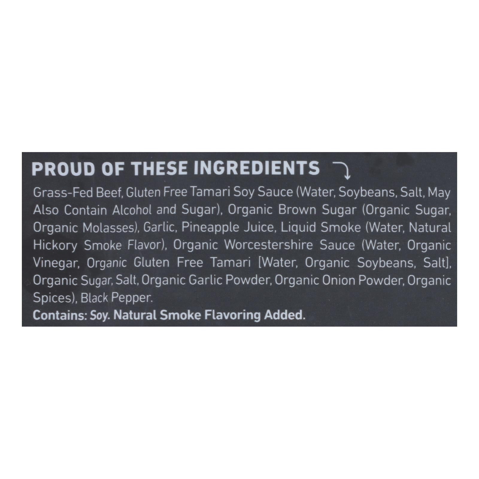 ingredients : grass-fed beef;gluten free tamari soy sauce;water;soybeans;salt;may also contain alcohol and sugar;organic brown sugar;organic sugar;organic molasses;garlic;pineapple juice;liquid smoke;natural hickory smoke flavor;organic worcestershire sauce;organic vinegar;organic gluten free tamari [water;organic soybeans;salt];organic garlic powder;organic onion powder;organic spices;black pepper