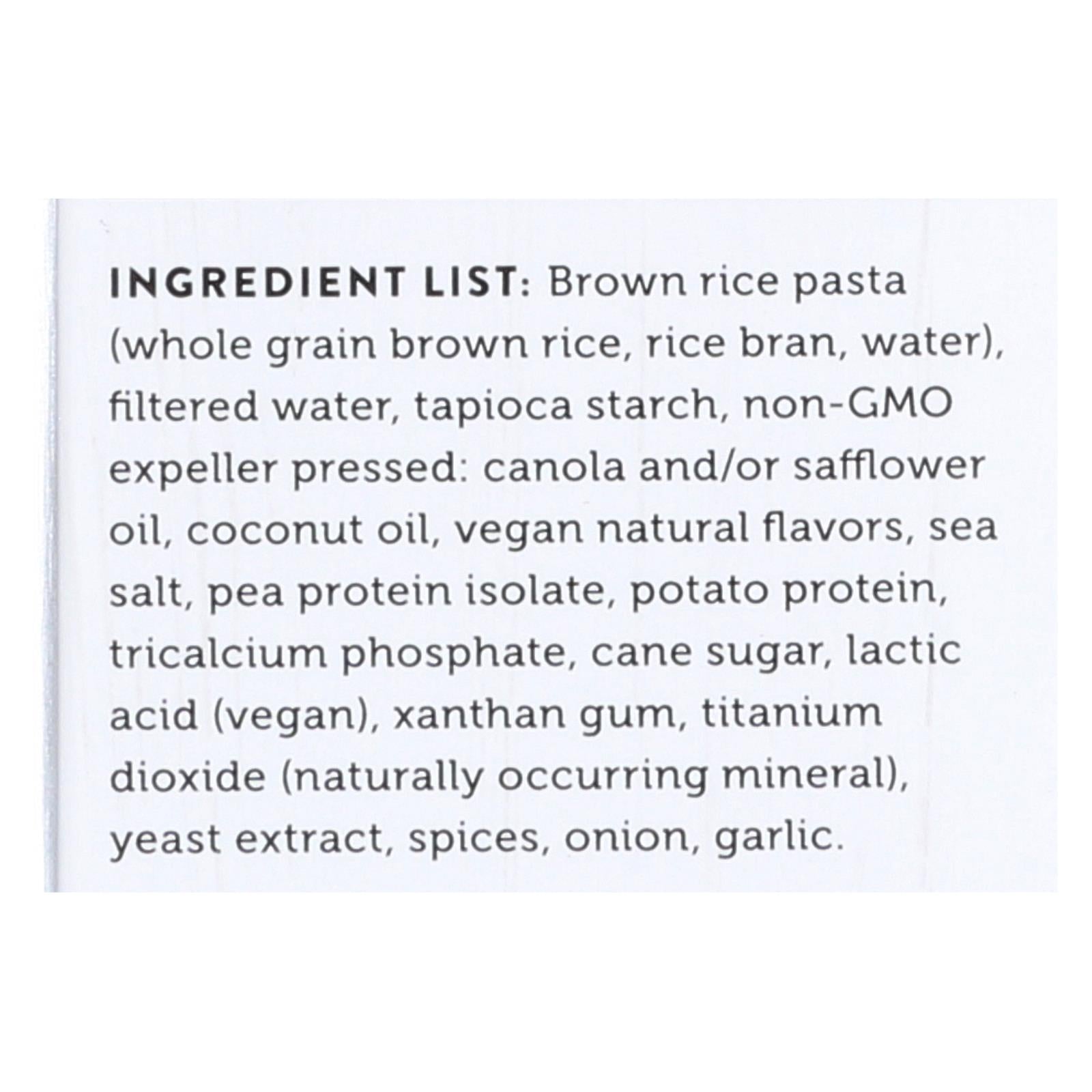 ingredients : ingredient list: brown rice pasta;whole grain brown rice;rice bran;water;filtered water;tapioca starch;non-gmo expeller pressed: canola and/or safflower oil;coconut oil;vegan natural flavors;sea salt;pea protein isolate;potato protein;tricalcium phosphate;cane sugar;lactic acid;vegan;xanthan gum;titanium dioxide;naturally occurring mineral;yeast extract;spices;onion;garlic
