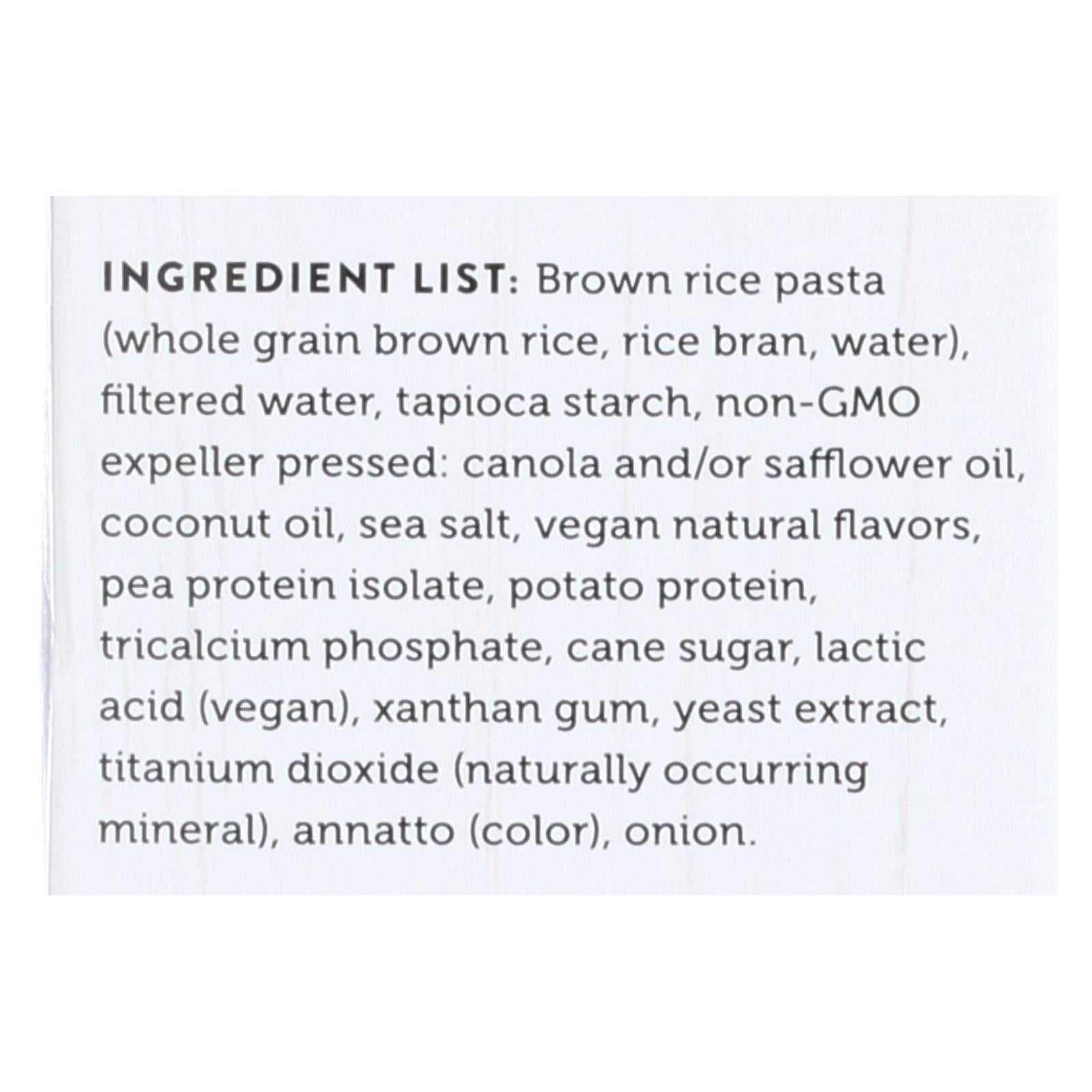 ingredients : ingredient list: brown rice pasta;whole grain brown rice;rice bran;water;filtered water;tapioca starch;non-gmo expeller pressed: canola and/or safflower oil;coconut oil;sea salt;vegan natural flavors;pea protein isolate;potato protein;tricalcium phosphate;cane sugar;lactic acid;vegan;xanthan gum;yeast extract;titanium dioxide;naturally occurring mineral;annatto;color;onion